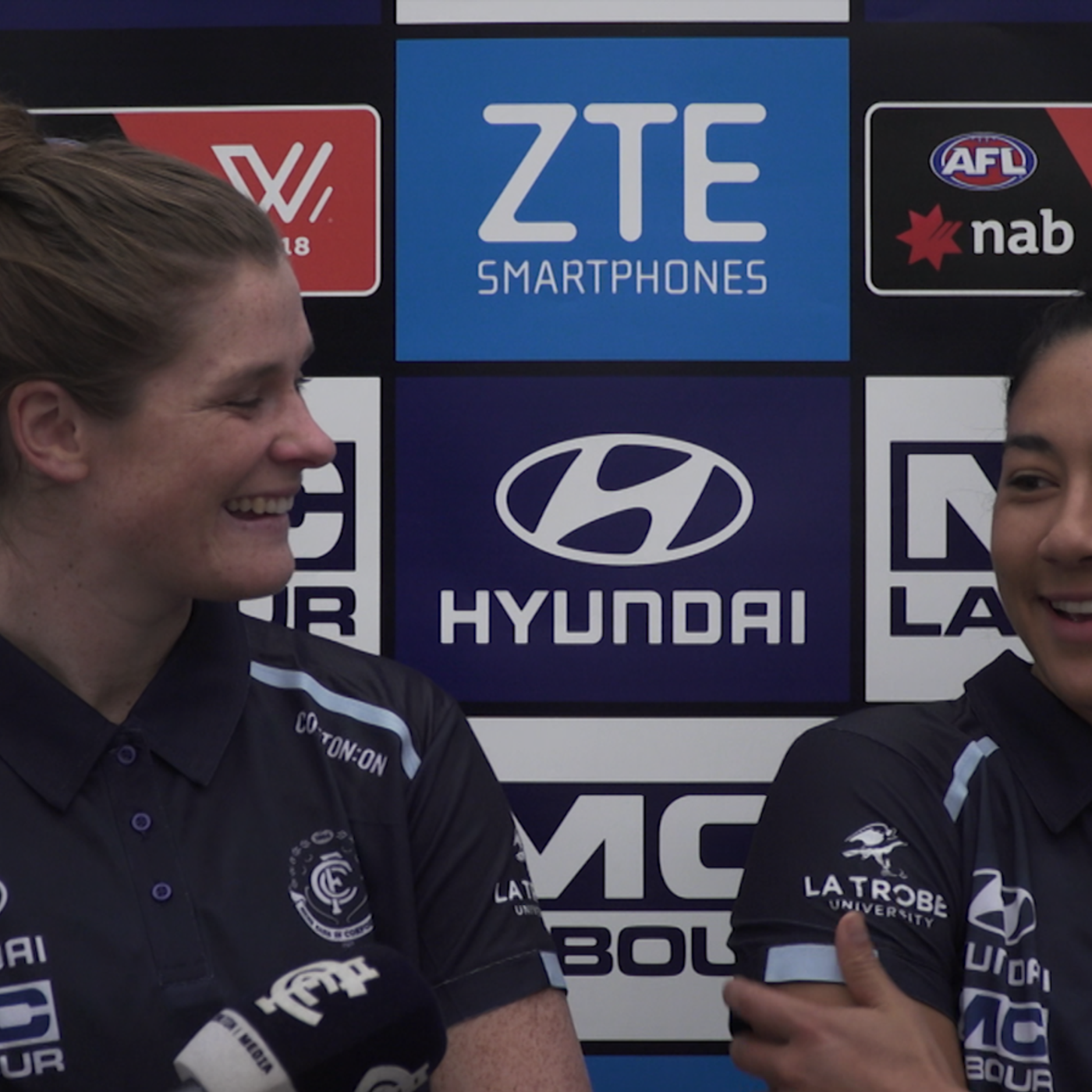 AFLW captain Brianna Davey, forward Darcy Vescio and co-major partner MC Labour front the media after recommitting to the Blues.
