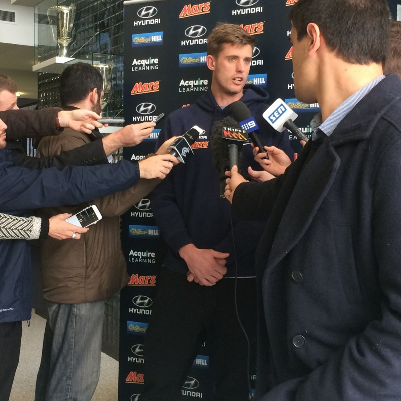 Jodi Lee Foundation ambassador Cameron Wood chats to the media ahead of Carlton's Round 10 clash against the Crows at the MCG.