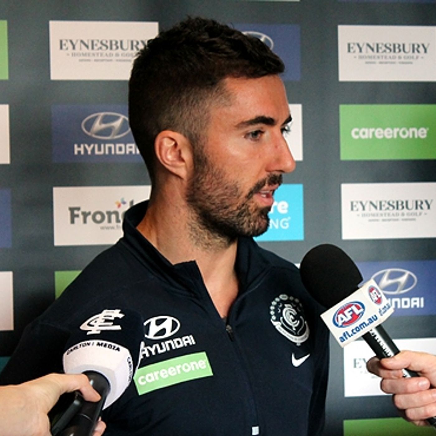 Carlton defender Kade Simpson speaks to the media at the Eynesbury Golf Club ahead of his 250th AFL match.
