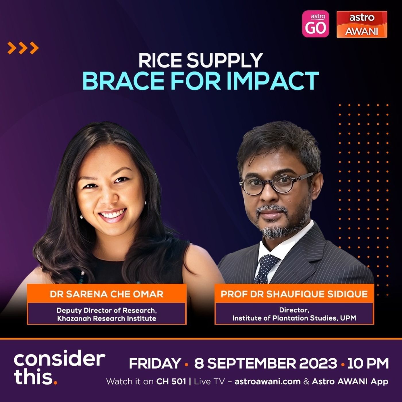 In light of India’s recent export ban on non-basmati white rice, how resilient or vulnerable is Malaysia's paddy industry and rice production? On this episode of #ConsiderThis Melisa Idris speaks to Dr Sarena Che Omar, Deputy Director of Research at Khazanah Research Institute, and Professor Dr Shaufique Fahmi Sidique, Director of UPM’s Institute of Plantation Studies.