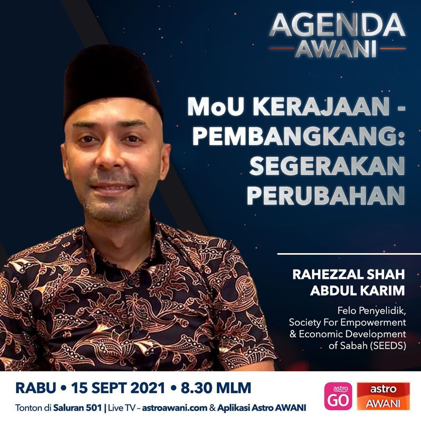 MoU antara kerajaan dan pembangkang, segerakan perubahan. Temu bual @nazri.kahar bersama Rahezzal Shah Abdul Karim, Felo Penyelidik SEEDS dalam #AgendaAWANI jam 830 mlm ini di saluran 501 dan astroawani.com.