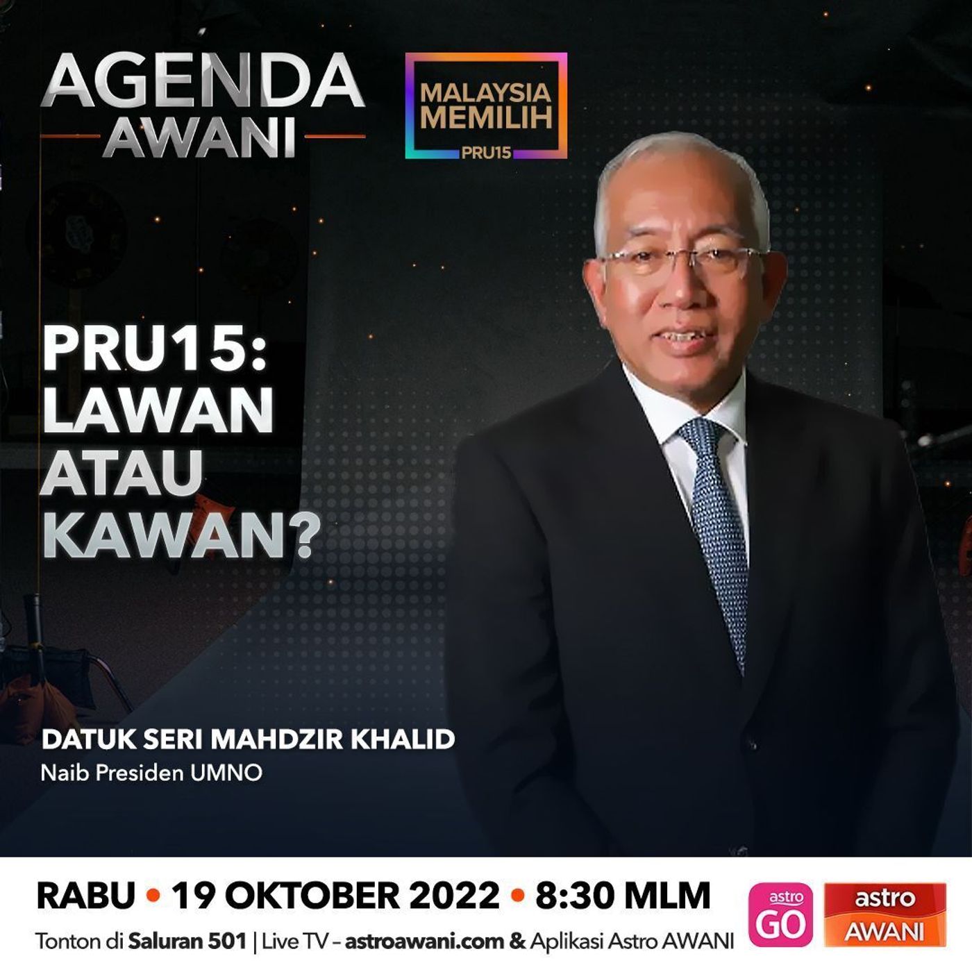 Menjelang #PRU15, ikuti temu bual bersama Datuk Seri Mahdzir Khalid, Menteri Pembangunan Luar Bandar dan juga Naib Presiden UMNO dalam #AgendaAWANI 830 mlm ini di saluran 501 dan astroawani.com.