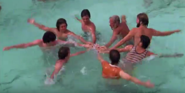 Someone in a Lacey Underall disguise dives off the diving board and the pool becomes the site of a Busby Berkeley flash mob. Are those still a thing?
