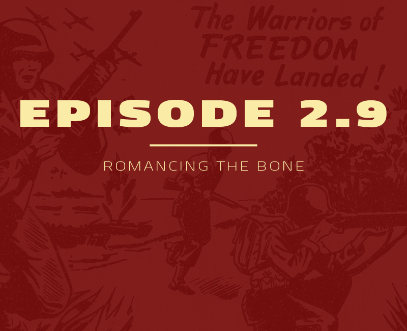 In… some unknown year, a team of nerds was sent careening through time and space, because a magick rainbow lady was bored. If you have a problem, if no one else can help, and if you can find them, maybe you can hire THE FIGHTING MONGEESE. Episode 2.9, “Romancing the Bone” was written, voiced, and