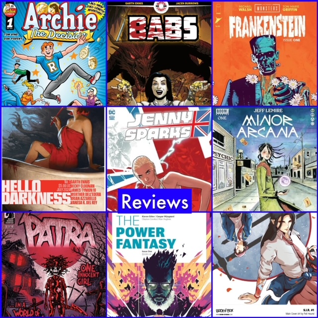 Reviews: Archie: The Decision one-shot, Babs #1,Universal Monsters: Frankenstein #1, Hello Darkness #1, Jenny Sparks #1, Minor Arcana #1, Patra #1, The Power Fantasy #1 & #2, S.I.R. #1.