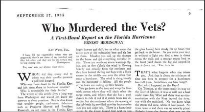 "This reflects his view that the deaths were not a natural disaster consequence, but the result of negligence and incompetence. Hemingway describes the dire aftermath of the storm, with veterans perishing, many found face down in the mangroves, and he highlights the government's failure to rescue them. Despite warnings, he wrote, the veterans were treated as expendable. Despite his sharp critique and overall public outcry and a congressional investigation, no officials were formerly charged with anything."