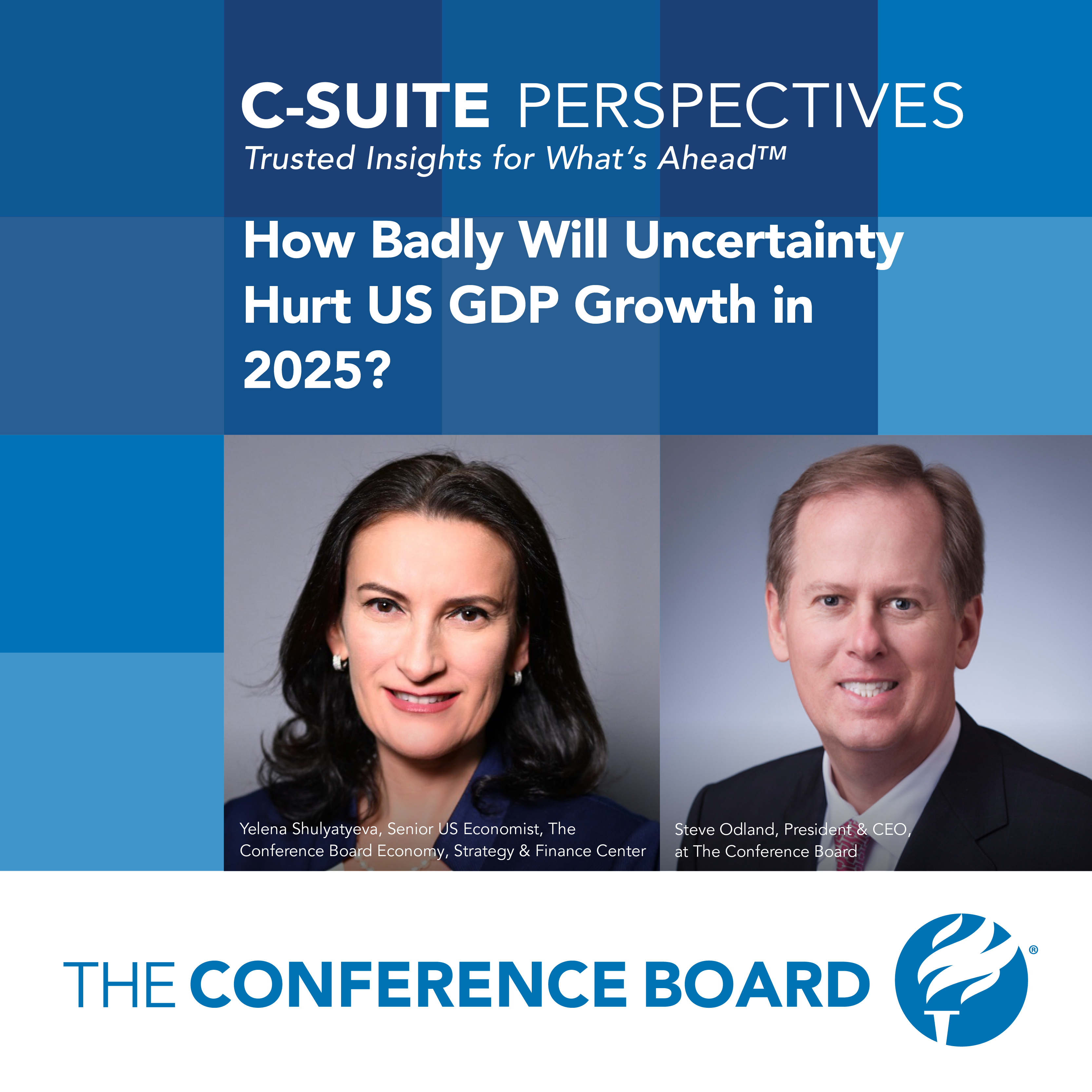 Join Steve Odland and guest Yelena Shulyatyeva, Senior US Economist at The Conference Board Economy, Strategy & Finance Center, to find out what's driving this economic uncertainty, how tariffs could affect GDP and inflation, and why The Conference Board expects the Federal Reserve to make three rate cuts in 2025.