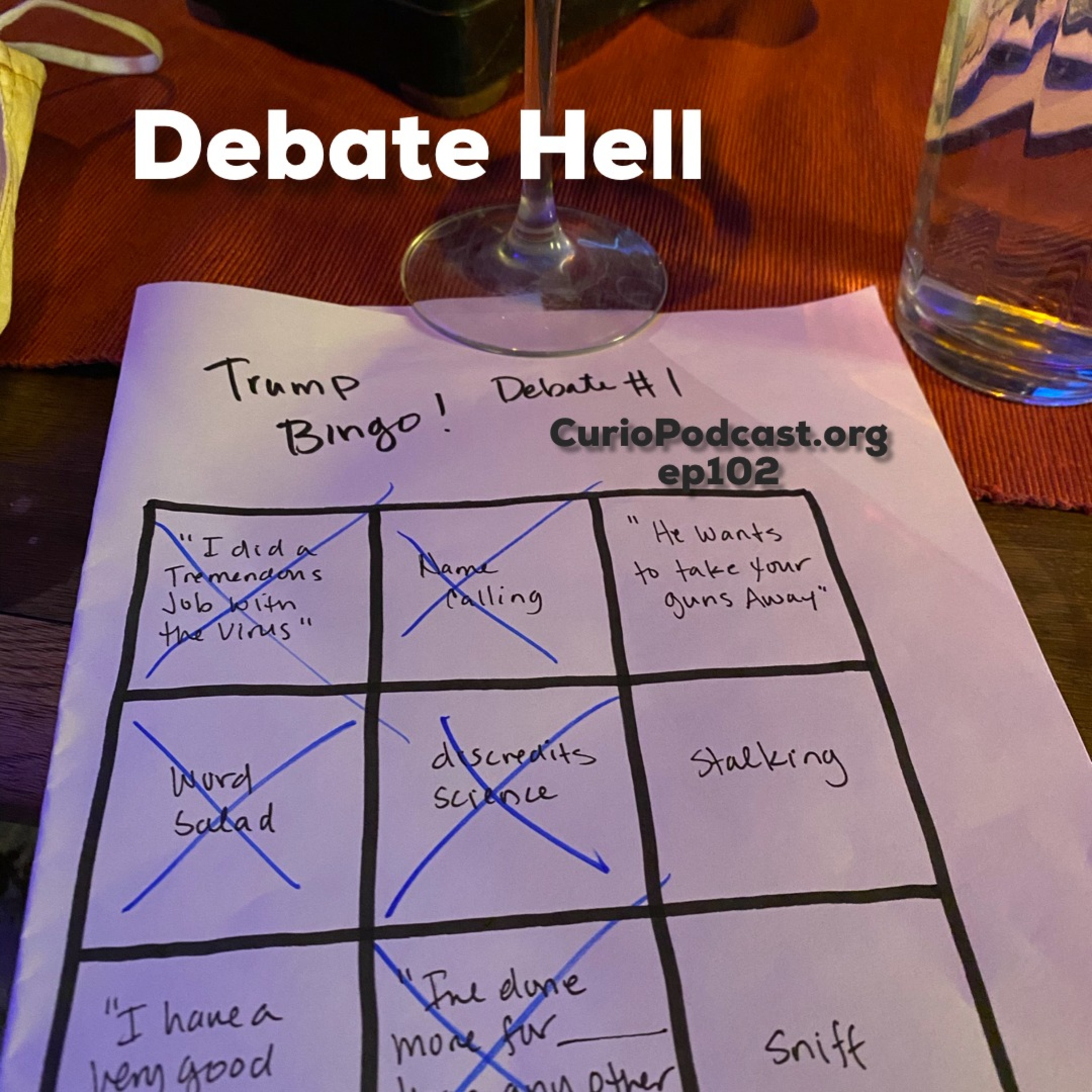 ep102 Some clips of the first Presidential Debate with a post-show roundup. The Curios play debate bingo with Doug, with wine.