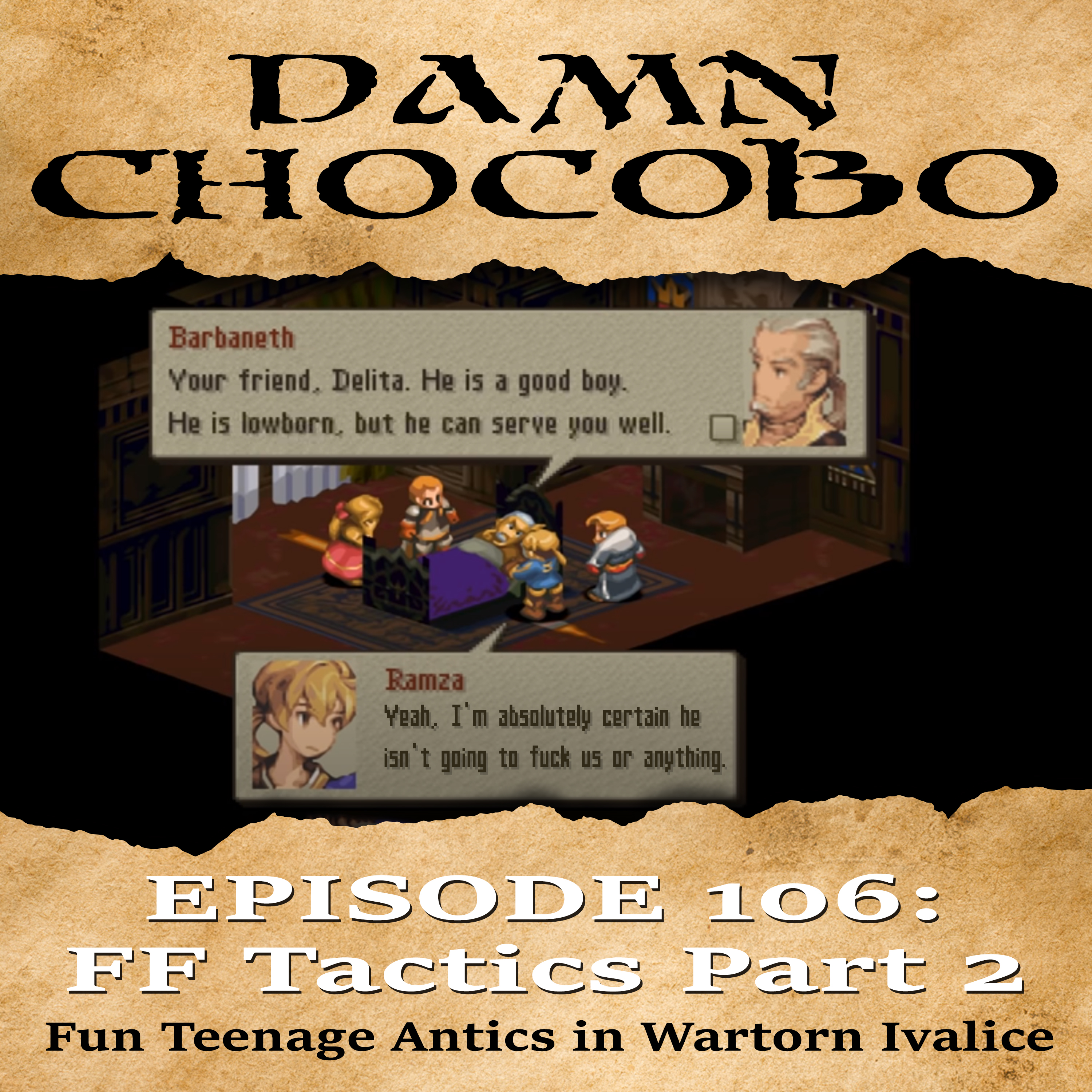 After 9 minutes of catching up the guys Get RIGHT BACK AT IT in Final Fantasy Tactics beginning the game proper with Chapter 1. Kicking ass and getting asses kicked, meeting shitty brothers and douchey "allies", and the beginning tidbits of an onslaught of DRAMA along with the ever slow progression into an ultimate badass await on the latest carefully thought through and even more craftily executed episode of DAAAAAAAAMN CHOCOBOOOOOOO!!!
