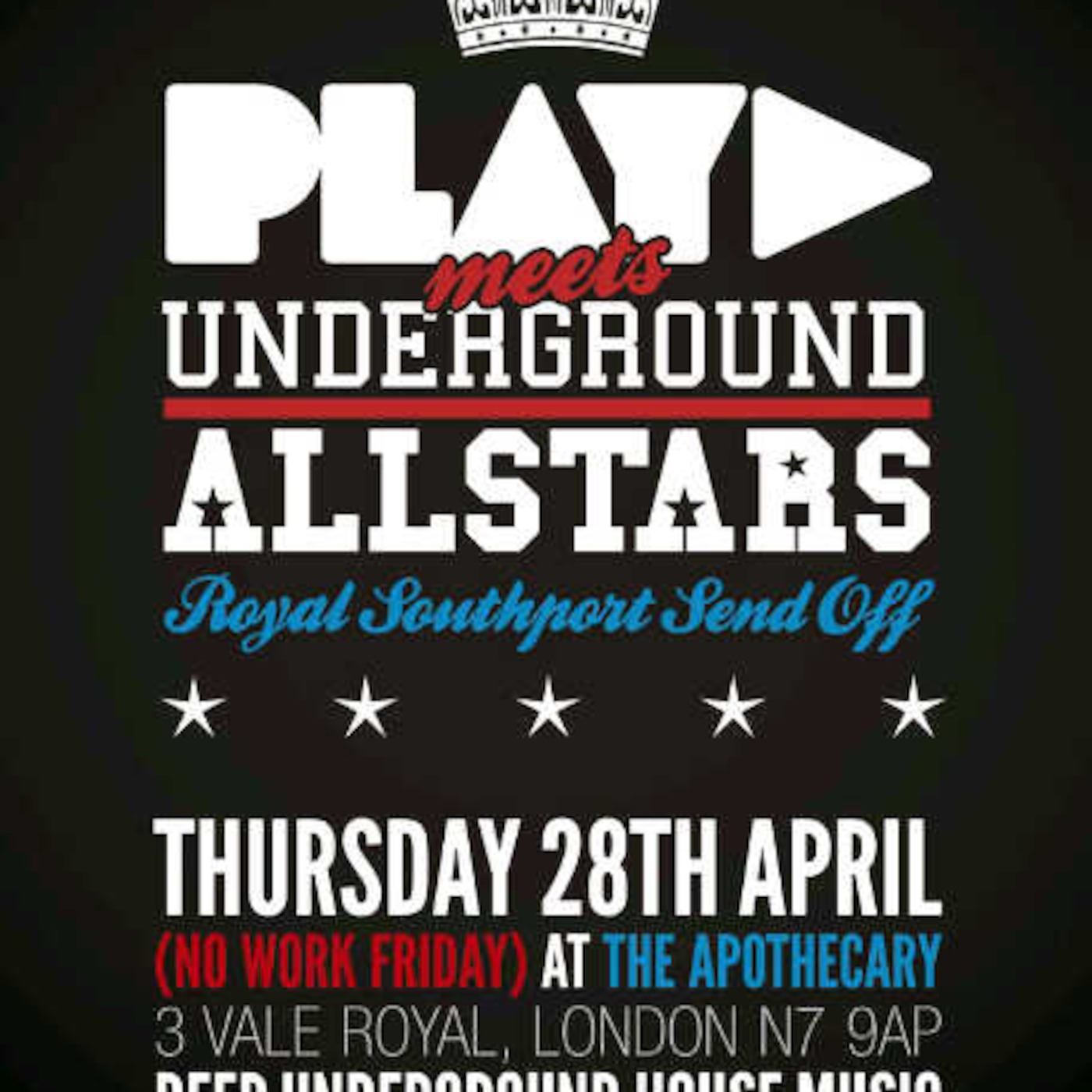 A Warm up for the Thursday Evening Bank Holiday Special > PLAY presents the Underground Allstars "A Royal Southport Send Off Party" Thursday 28th April 2011. Also over this extended Bank Holiday Weekend Catch DJ C Sharp at "Bank Holiday Launch Party" on Saturday 30th April 2011 and the Private Pyjama Party... for those that know ;-)