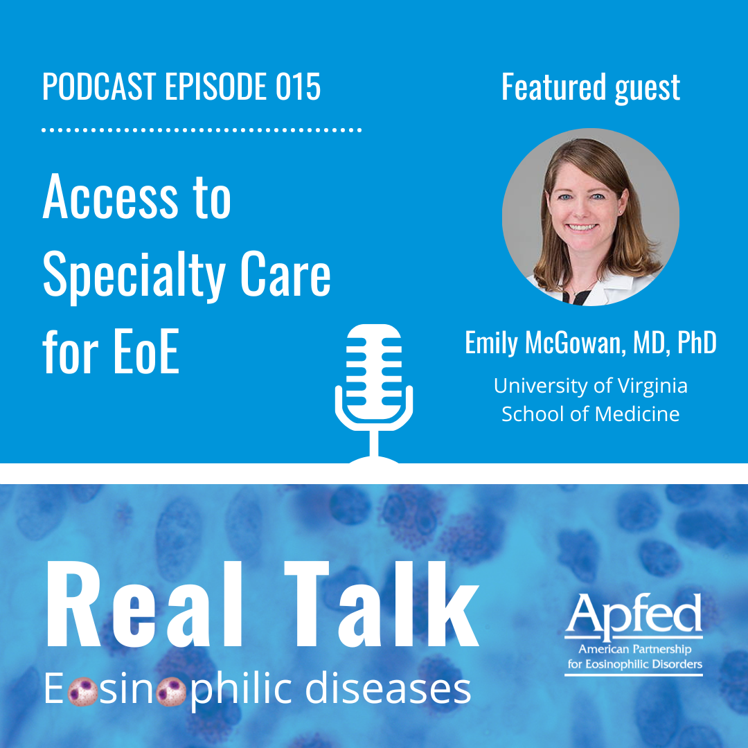 Co-hosts Ryan Piansky and Mary Jo Strobel, APFED's Executive Director, talk with guest Emily McGowan, MD, PhD, about access to specialty care for eosinophilic esophagitis (EoE).