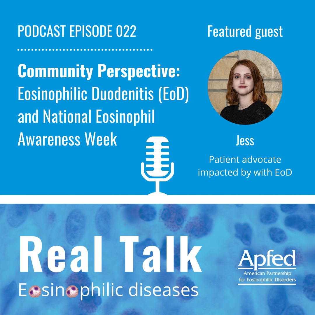 Co-hosts Ryan Piansky, a graduate student and patient advocate living with eosinophilic esophagitis (EoE) and eosinophilic asthma, and Holly Knotowicz, a speech-language pathologist and feeding specialist living with EoE who serves on APFED's Health Sciences Advisory Council talk with guest Jess Seidel, a patient advocate impacted by eosinophilic duodenitis.