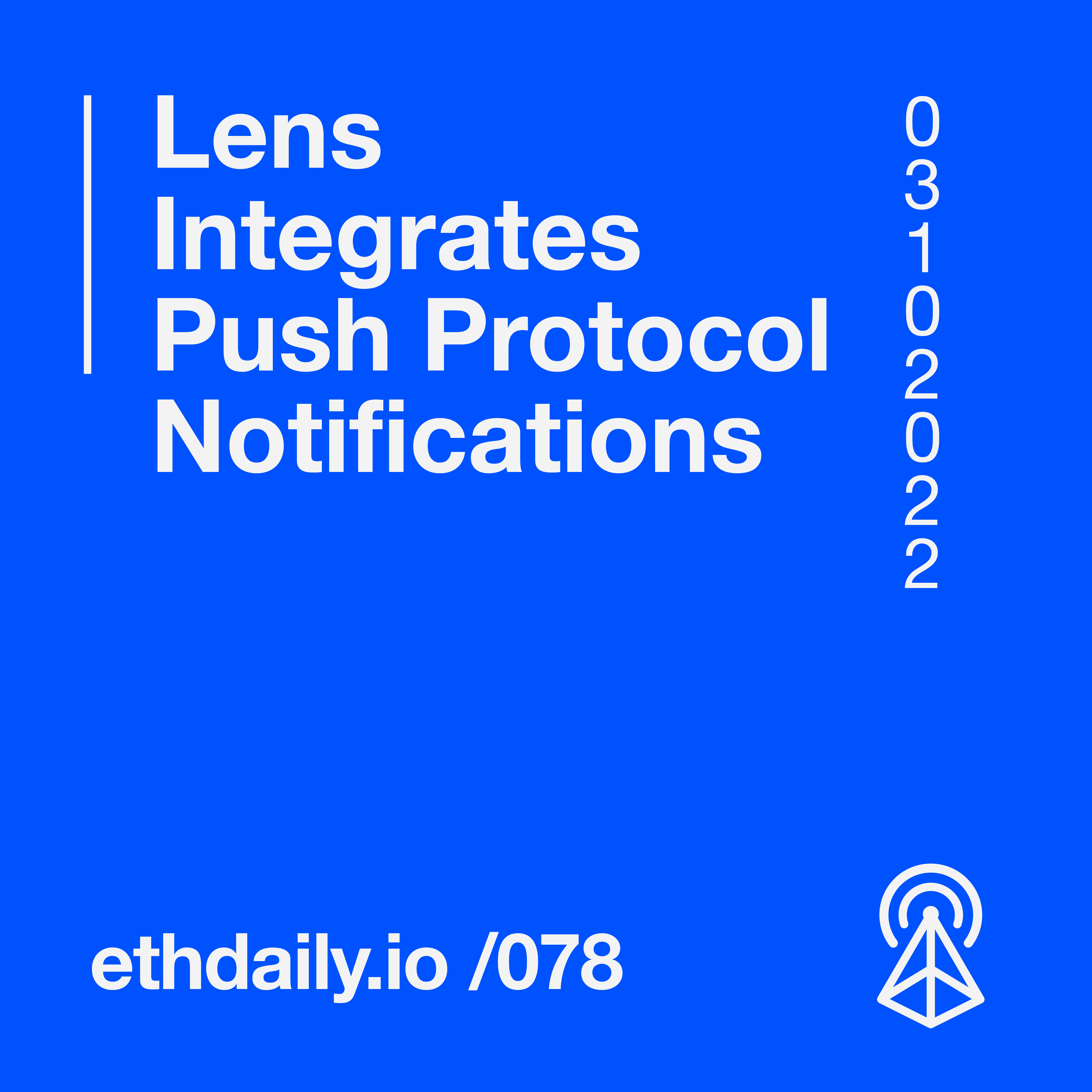 Lens Protocol integrates Push Protocol notifications. LensPort launches an NFT marketplace. A judge denies Alexey Pertsev's appeal. And ENS hits record-breaking monthly registrations. Read more: https://ethdaily.io/078