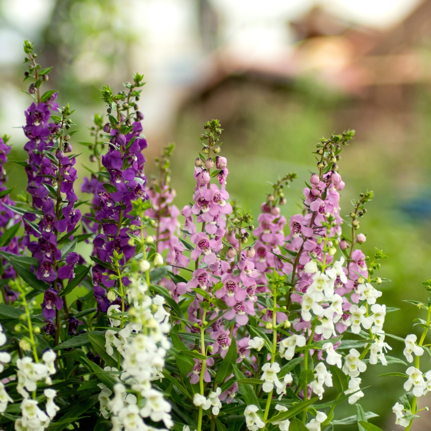 Angelonia produces stalks of little flowers, similar to stock flowers, that last a long time on the plant, flowering steadily all through till late summer.
