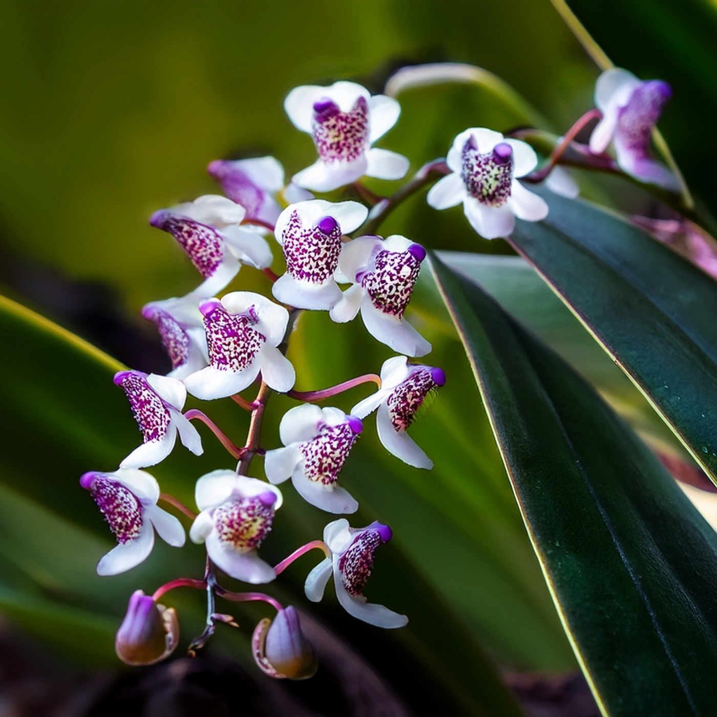 One fairly easy to grow but underused example is the South East Asian native with the common name of jewel orchid. Its botanical name is Ludisia discolor. This is a terrestrial plant that grows in soil in a pot, and it has narrow leaves. The color of the leaves varies from dark red to maroon and there is striking veining. The leaves grow on succulent stems that hang over the sides of the pot. The flowers appear in late winter to mid spring and are white in color and a little like snapdragons in form and are white in color.