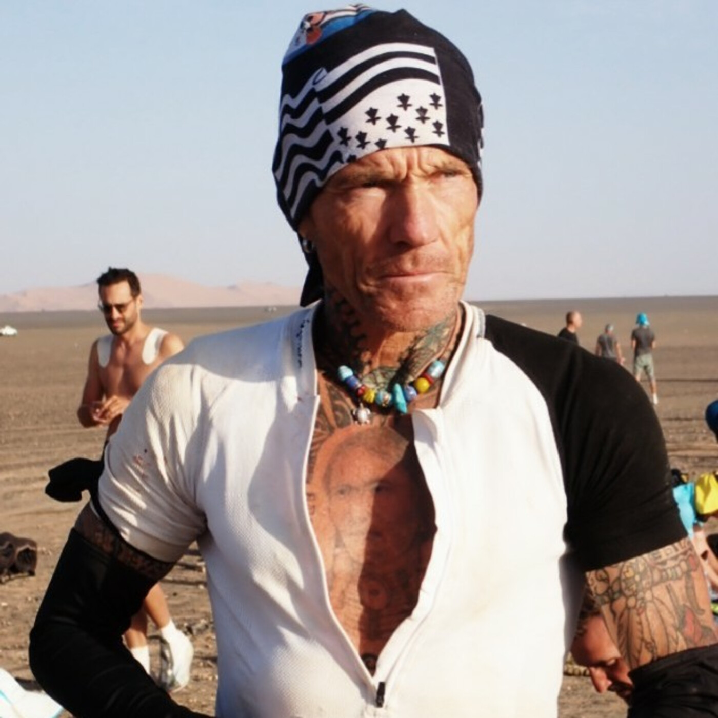 Le Marathon des sables continu avec dans le peloton un coureur très coloré..