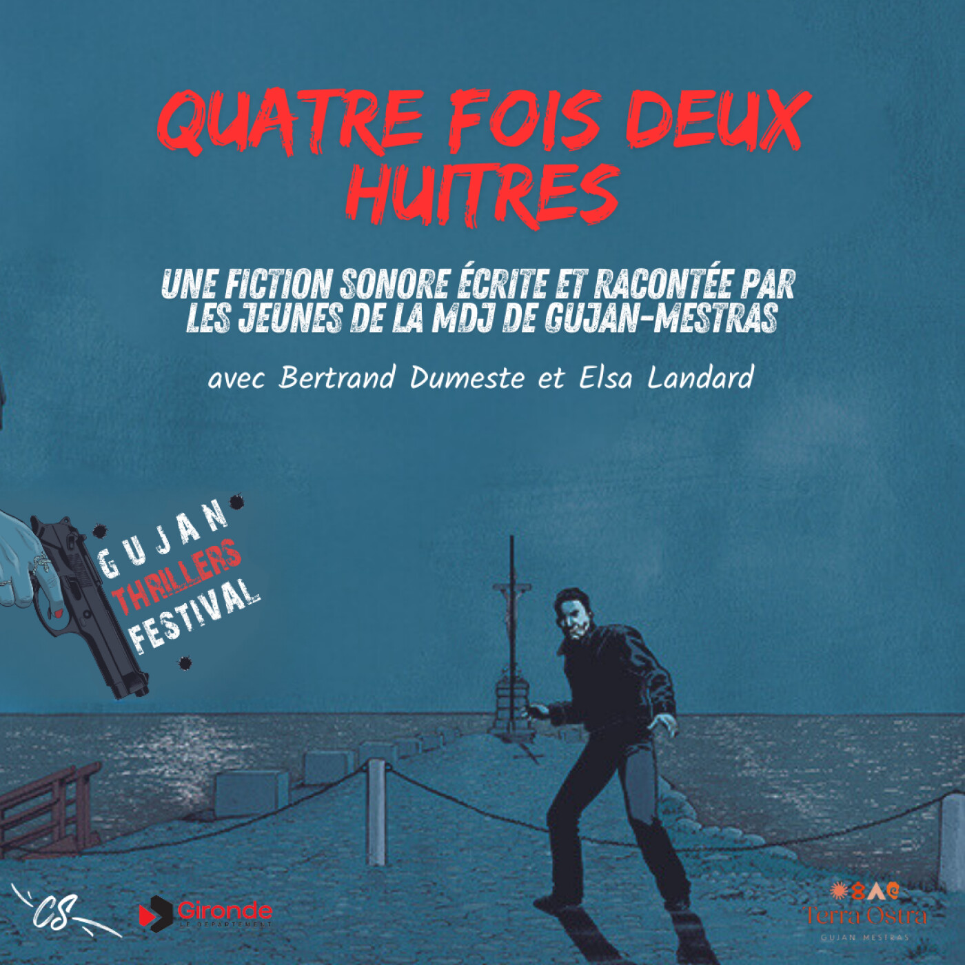 Accompagnés par l'auteur de polars Bertrand Dumeste sur l'écriture et par Elsa Landard de l'association Chantier Sonore sur l'enregistrement et la mise en sons, Eloan, Orkatz, Angèle, Louise, Jade, Tiago, Manon, Sybille, Léandro et Sirius, ont imaginé une histoire bien locale pour célébrer les 10 ans du Gujan Thrillers Festival. Arme du crime ? Une coquille d'huitre !