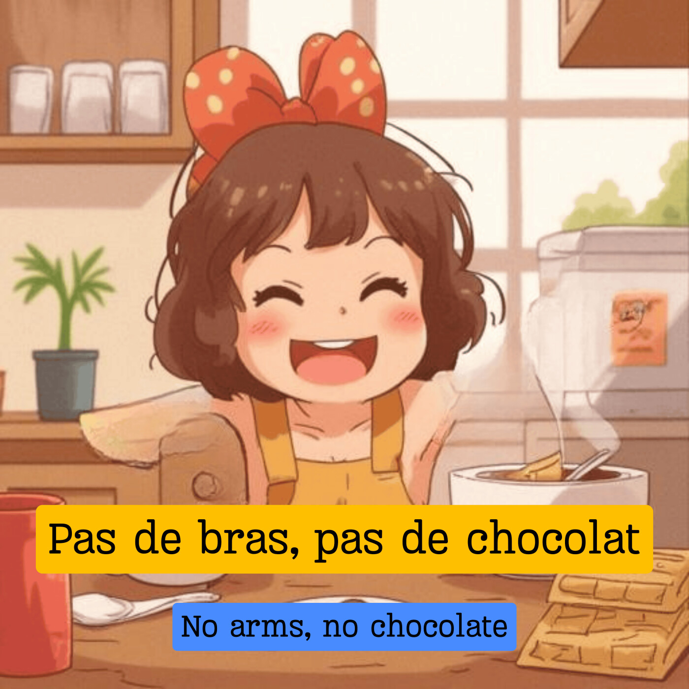 Hello everyone, today I'm going to talk a little about jokes and riddles for children. Why? Because today's expression comes from a children's joke, and it's always good to talk about jokes when learning a language to study double meanings or hidden meanings. Then, in the second part, I'll explain when to use today's French expression, "Pas de bras, pas de chocolat" (No arms, no chocolate). See you tomorrow!