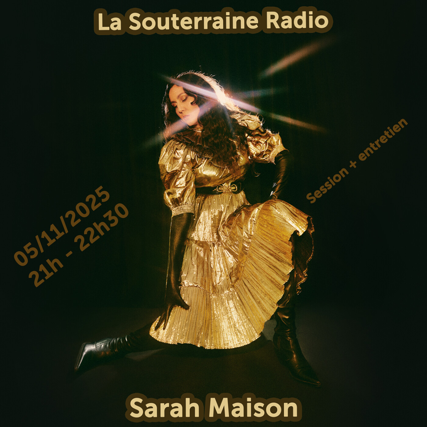 Mercredi 5 novembre, La Souterraine Radio ouvrait ses micros à une artiste singulière et envoûtante : Sarah Maison. Chanteuse, compositrice et performeuse, elle incarne une pop francophone métissée, nourrie de son héritage franco-marocain et d’un imaginaire musical où se croisent disco orientalisant, chanson française et psychédélisme solaire. Après deux EPs remarqués, elle vient de dévoiler son premier album, DIVAD, salué pour son audace et sa richesse sonore.