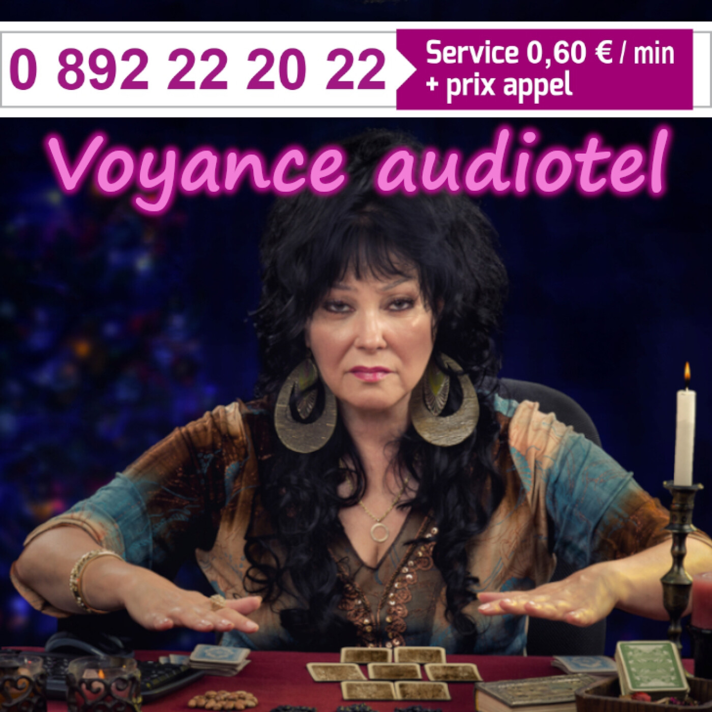 Tarif clair et transparent : 60cts/mn. Vous décidez de la durée de votre séance. Composez le 0892 222 022 (France), c’est sans engagement.