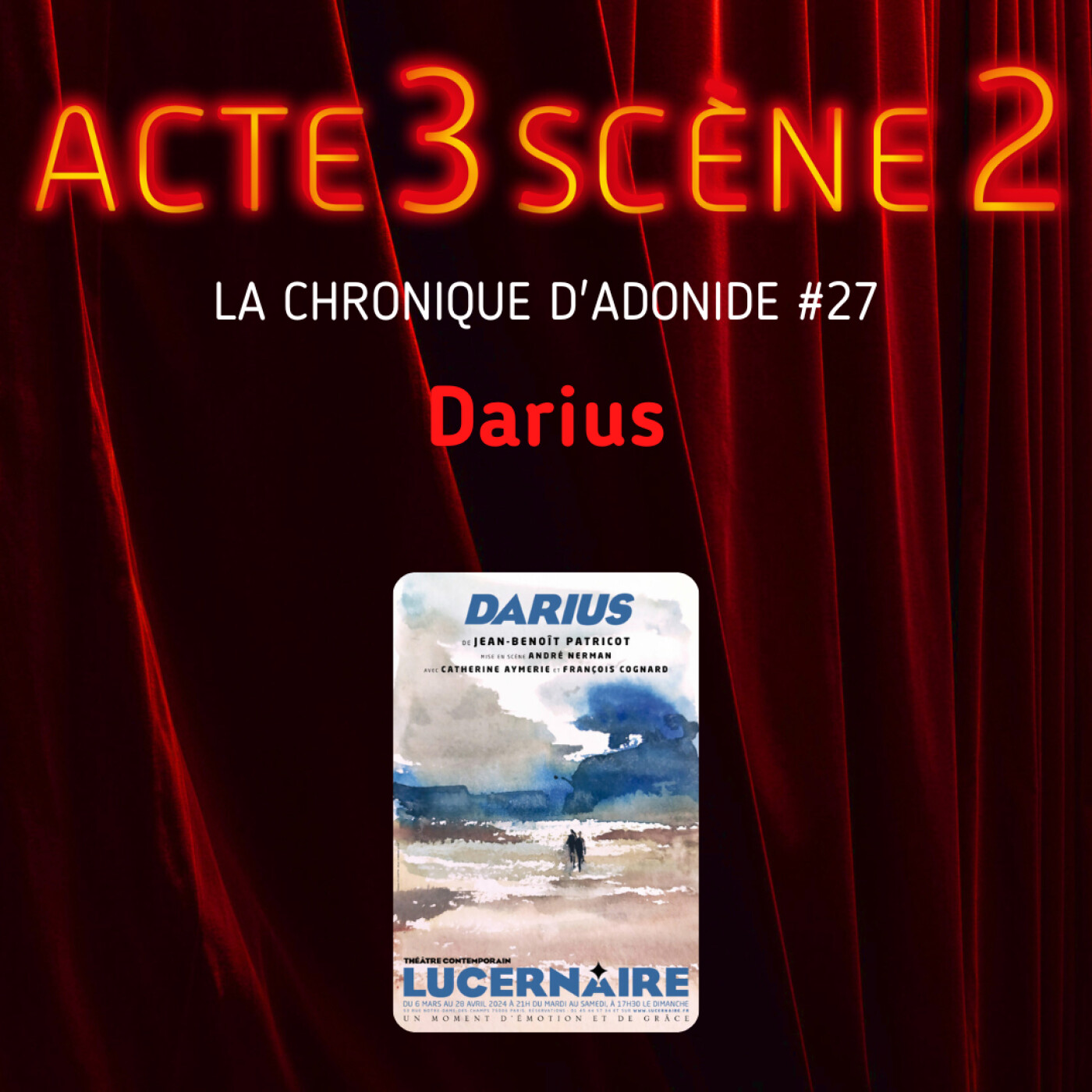 Adonide nous parle de la pièce "Darius" de Jean-Benoît Patricot dans laquelle le fils de l'héroïne qui a 19 ans, est atteint d'une maladie dégénérative. Sa mère va tout mettre en oeuvre pour lui faire vivre ses derniers moments de bonheur par le parfum. Elle va pour cela contacter un parfumeur, Paul, par écrit et l'engager pour lui permettre de voyager alors qu’il lui est impossible de se déplacer. C'est cette histoire et cette correspondance qui sont admirablement racontées par le jeu des deux comédiens.