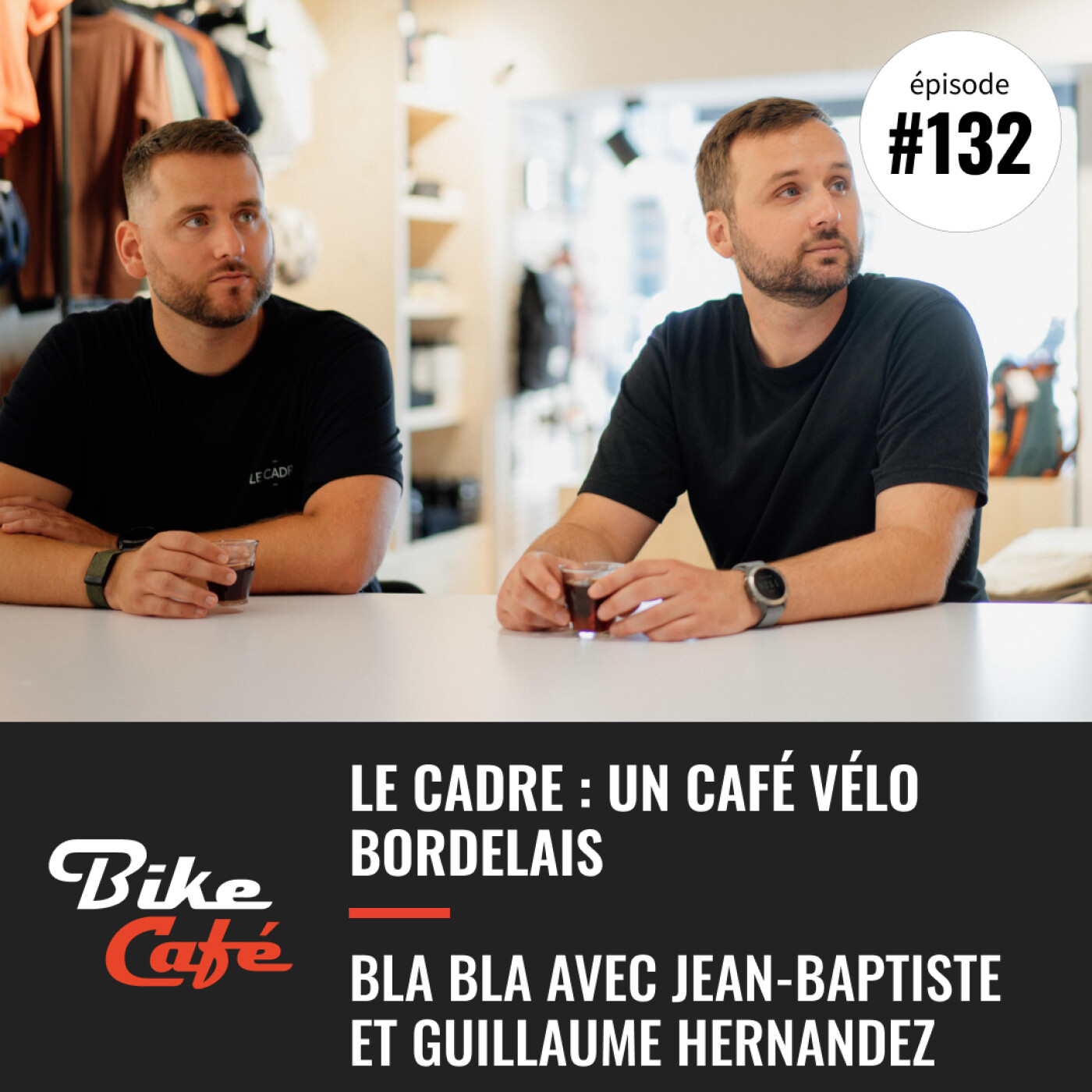 Aujourd’hui, je vous invite à Bordeaux, à la rencontre des frères Hernandez, qui ont ouvert en juillet dernier un Café Vélo baptisé « Le Cadre ». Jean-Baptiste l’ainé qui était opticien et Guillaume, qui a travaillé dans le monde du web et de l’outdoor son cadet, murissaient ce projet depuis 3 ans. Ces triathlètes, plutôt formatés pour être des 2ème ligne au Rugby, que des cyclistes grimpeurs de cols, avaient du mal à choisir leurs tenues de vélo. Ils aiment les belles marques comme Rapha, Café du Cycliste, Pas Normal Studio. Ils rêvaient d’une boutique où on pourrait venir essayer ces équipements. Ils s’installent donc à Bordeaux, dans le « triangle d’or » de cette magnifique ville non loin de la place des Quinconces et de la place des Grands Hommes.