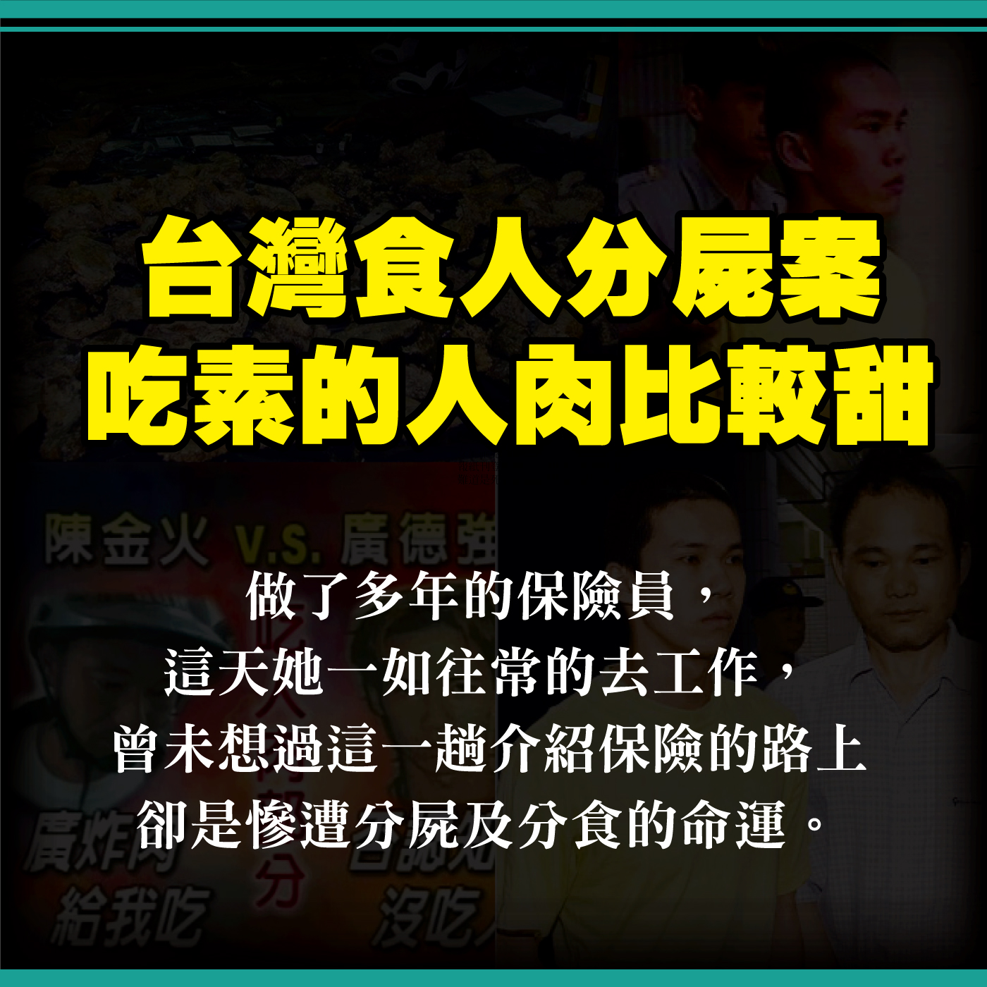 這起事件發生在台灣2003年12月,一名女性,施金池,做了多年的保險員,這天她一如往常的去工作,曾未想過這一趟介紹保險的路上,卻是慘遭分屍的未來,此案為當年非常有名的「台中女保險員分屍案」,是非常泯滅人性的一起事件。