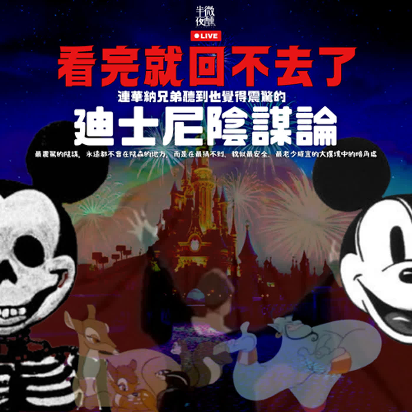 最震驚的陰謀,永遠都不會在陰森的地方,而是在最猜不到、貌似最安全、最老少咸宜的大環境中的暗角處。迪士尼作為地球上最大的娛樂帝國,販賣童心童真,卻被指是最龐大的陰謀文化輸出重鎮,究竟是小矮人太矮、玻璃鞋太焗、睡公主唔知醒、小魚仙太腥、巴斯光年太似鄧梓峰、唐老鴨無著褲定Disney + 個app太慢太廢先係神秘組織的驚天大陰謀?