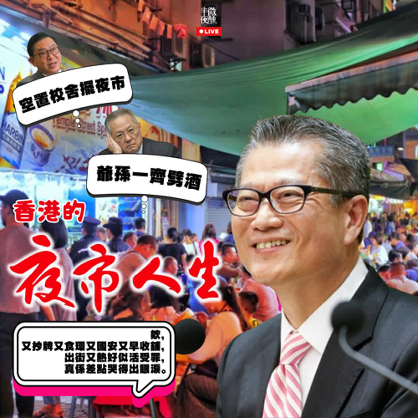 疫後本地經濟復甦疲弱,加息、樓巿股巿下滑、移民潮等等因素令情況雪上加霜。政府突然諗到(無錯,只係諗而已)話不如搞活夜巿,促進巿民晚間消費,大搞內循環,商貿、樓巿、股巿、金融、旅遊都拋諸腦後了。有人話喺空置校舍擺夜巿,唔知係學校靈探定學校風雲;有人話鼓勵兩爺孫一齊劈酒,健康一至四放蕩五六日,Dont care what u say I don’t give a fxxk,唔知係探孫女班定減輕人口老化政策。今日蘭桂坊夜場勝地都唔再係出邊排隊打蛇餅嘅年代,你仲以為呢度啲女搶住錫,好多咖喱雞係頸,Jolibee就可能有。想起夜巿,當然想起台灣,有麥可被撞飛,才是夜巿的魅力。香港的夜巿,欸,又抄牌又食環又國安又早收舖,出街又熱好似活受罪,真係差點哭得出眼淚。