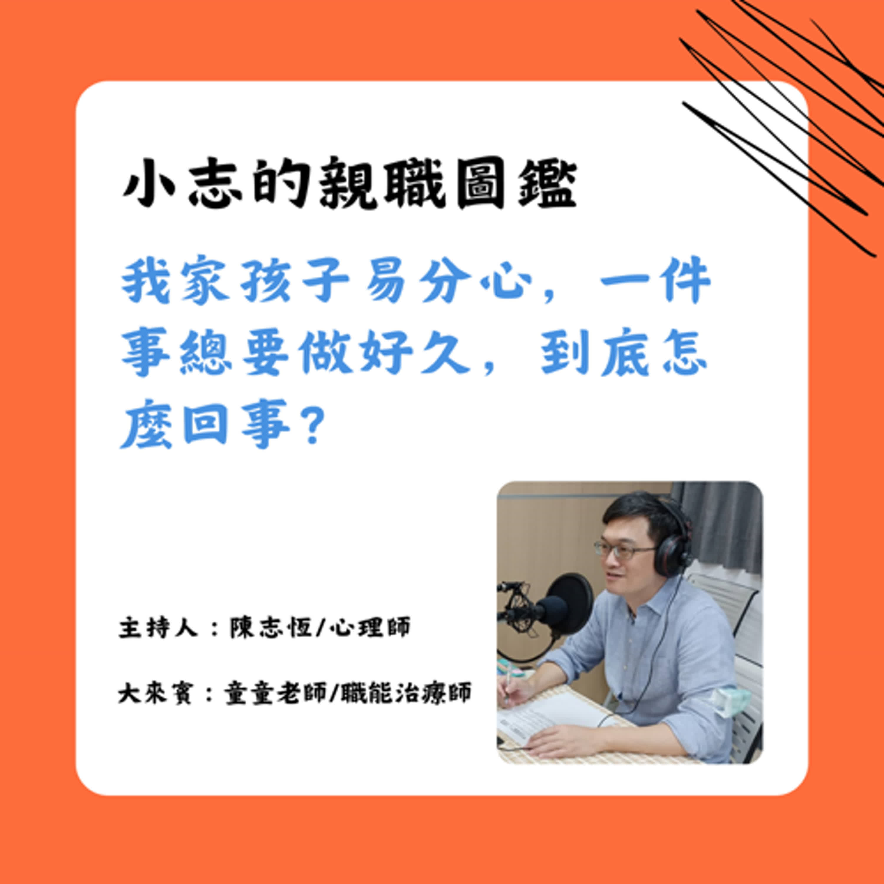 🟠上集主題:我家孩子易分心,一件事總要做好久,到底怎麼回事? 🟠主 持 人:陳志恆諮商心理師 🟠本集來賓:童童老師/職能治療師 🟠本集摘要: 01:50 心理治療與物理治療的差別? 04:06 常見的幼兒成長階段問題有哪些? 05:40 專注力不足的現象,對幼兒而言是正常的嗎? 12:15 不同的兒童發展階段,是否有不同專注力的展現? 23:08 孩子寫作業的背後原因與家長應對方式