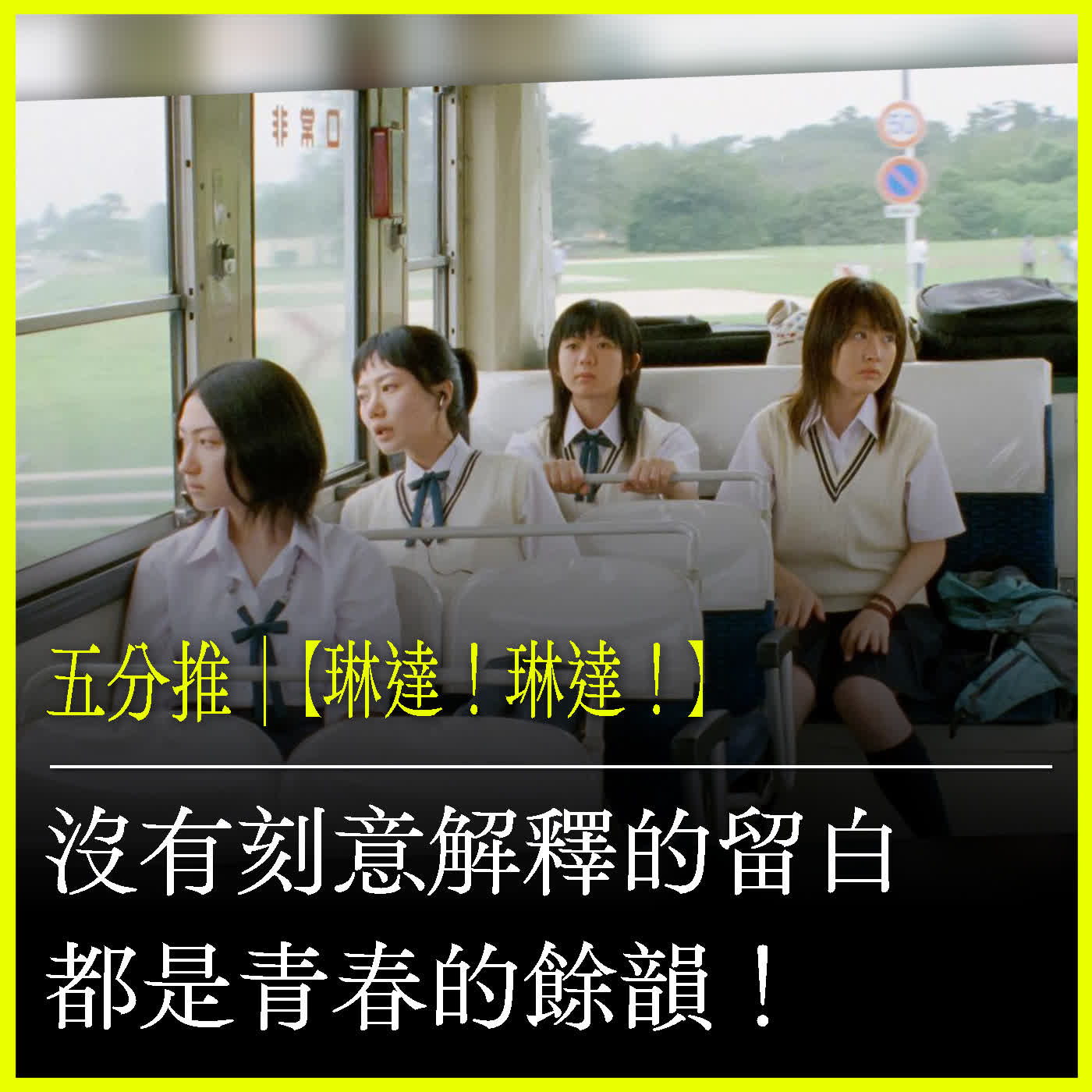 整部片是講述一段發生在校園的故事,簡單卻深刻,搭配日本龐克搖滾樂團 THE BLUE HEARTS 的幾首經典曲目〈我的右手〉、〈Linda Linda Linda〉再適合不過。
