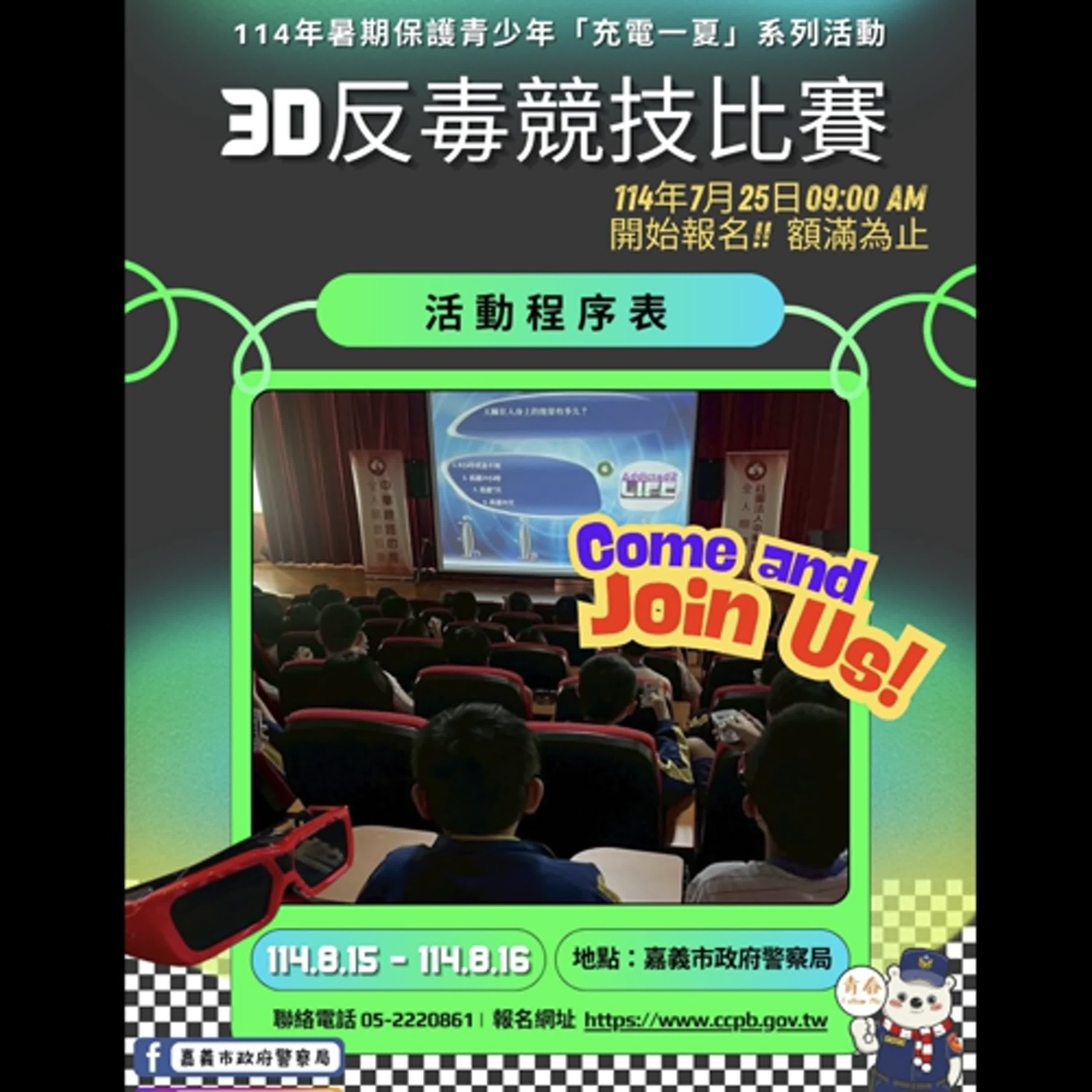 A:我們警察局從早期91年的野外求生營開始,至今已延續舉辦23年,在暑期規劃各項多元體能、休閒及知識學習課程活動,防杜少年偏差行為及被害,營造優質少年成長環境,每年都受到雲嘉嘉地區民眾高度期待與熱烈參與。今年特別爭取中央補助經費,與少年輔導委員會合作舉辦多場親職沙龍講座,還有即將在8月15、16日登場的3D反毒競技比賽、舊時警察文化體驗營等活動,前所未有的首創活動精彩可期。活動公開報名訊息持續在本局臉書粉絲專頁及IG發布,邀請大家持續追蹤,把握機會、不要錯過喔!