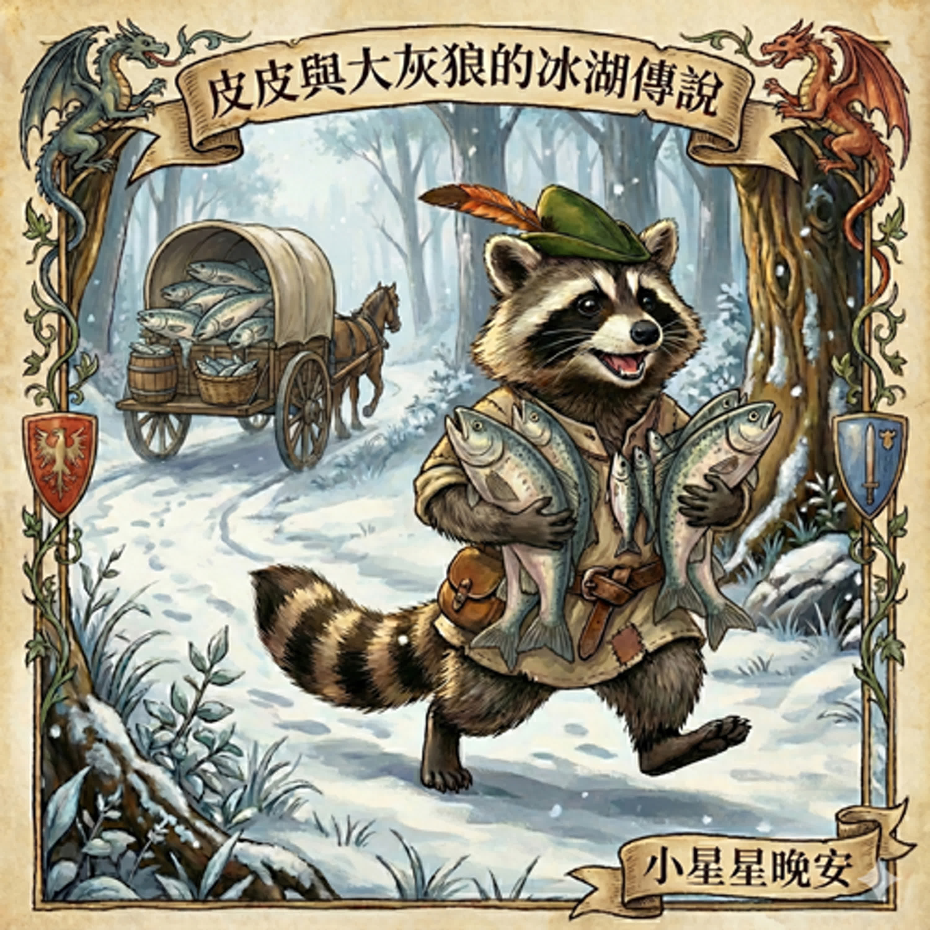 主題內容:寒冬降臨,浣熊皮皮為了餓肚子的弟妹,冒險踏上積雪的山路。面對載滿鮮魚卻呼嘯而過的馬車,皮皮竟然大膽地決定「裝死」攔截!究竟這場賭上性命的演技,能讓他順利帶回救命大餐,還是會不幸變成人類的帽子呢?