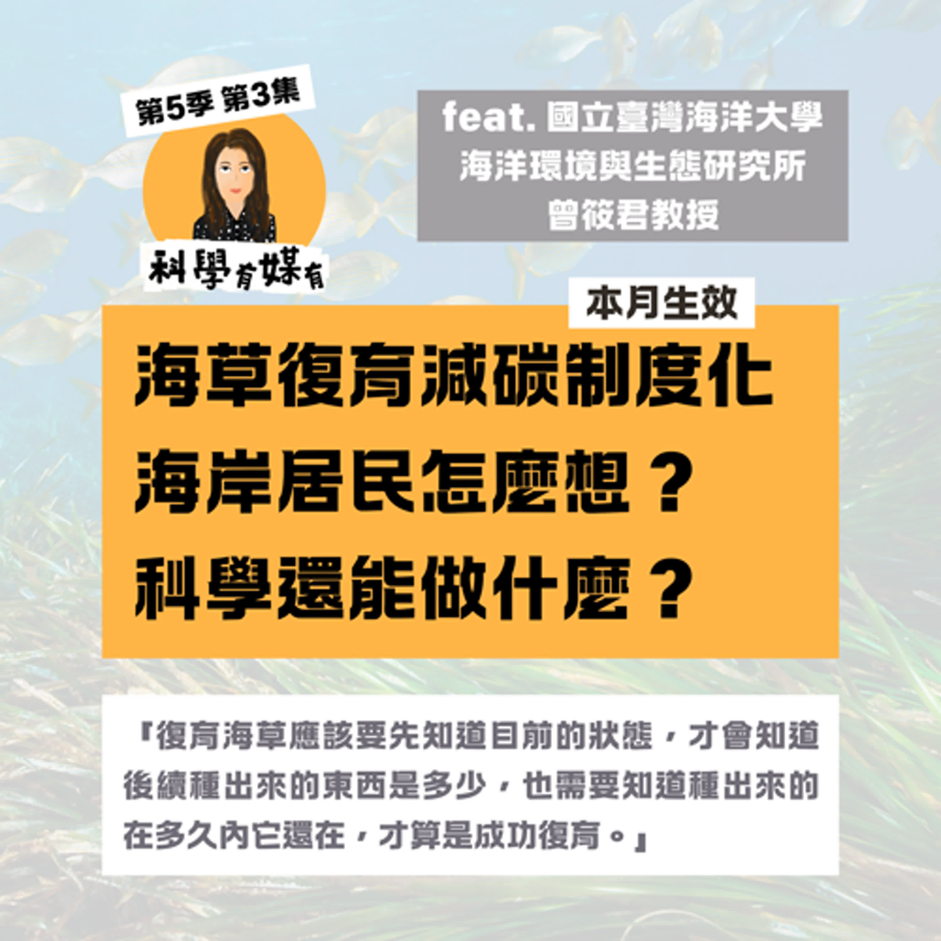 就在這集播出的前幾天(7/24),節目中提到的海草復育,作為藍碳方法學已經正式在台灣作為制度化啟動。海草是一種生長在淺海、能夠行光合作用的海洋被子植物,不僅是重要的生態棲地,也被視為潛力極高的「藍碳生態系」。