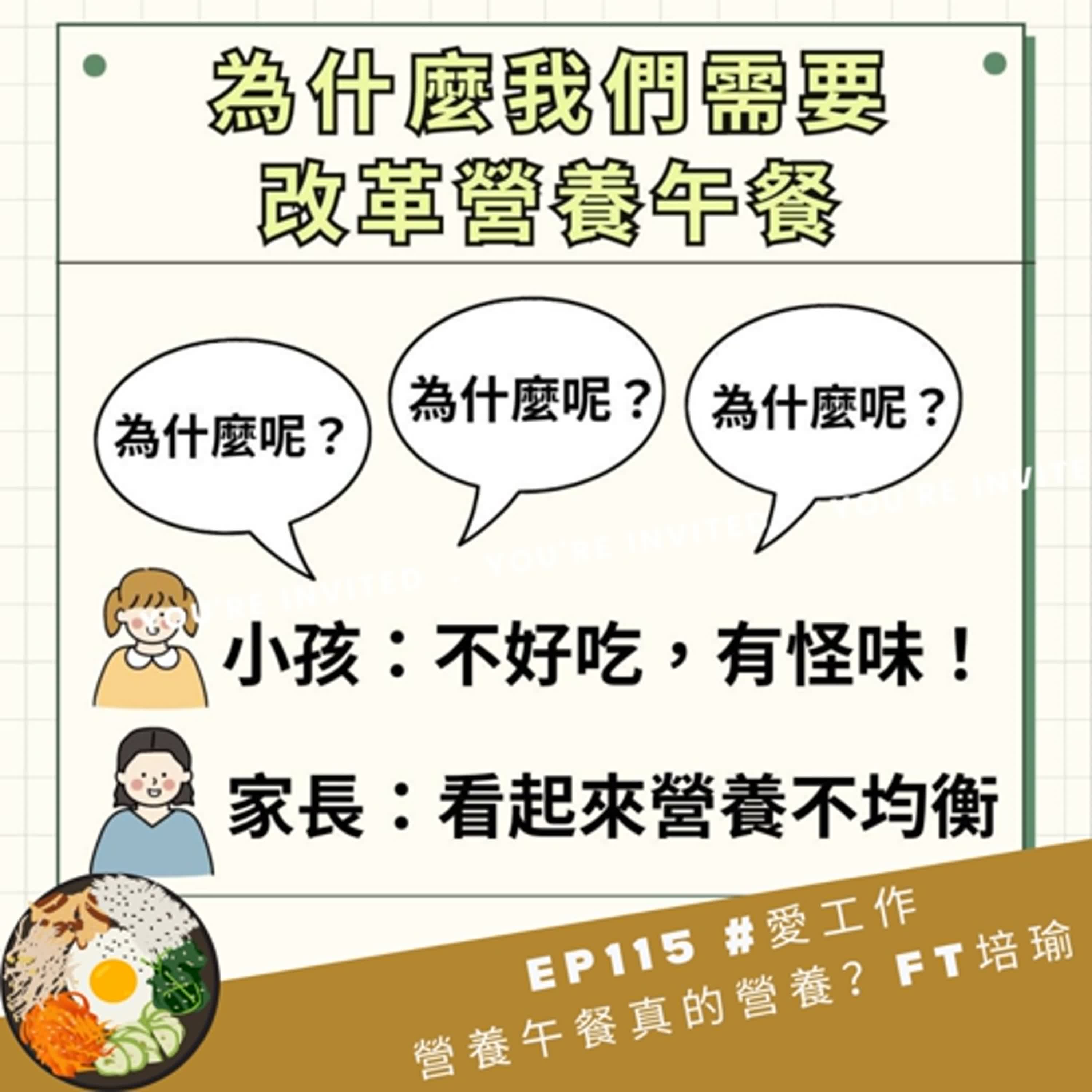 你知道台灣的營養午餐除了不總是那麼美味可口之外,背後還存在著什麼樣的問題嗎?為什麼我們不能吃得更好更營養更健康呢?本集節目我們邀請剛從韓國考察營養午餐返台的培瑜立委和我們一起對談,分享台灣營養午餐專法推動之必要。最後加碼與大家分享加班當爸媽2.0的動向唷!