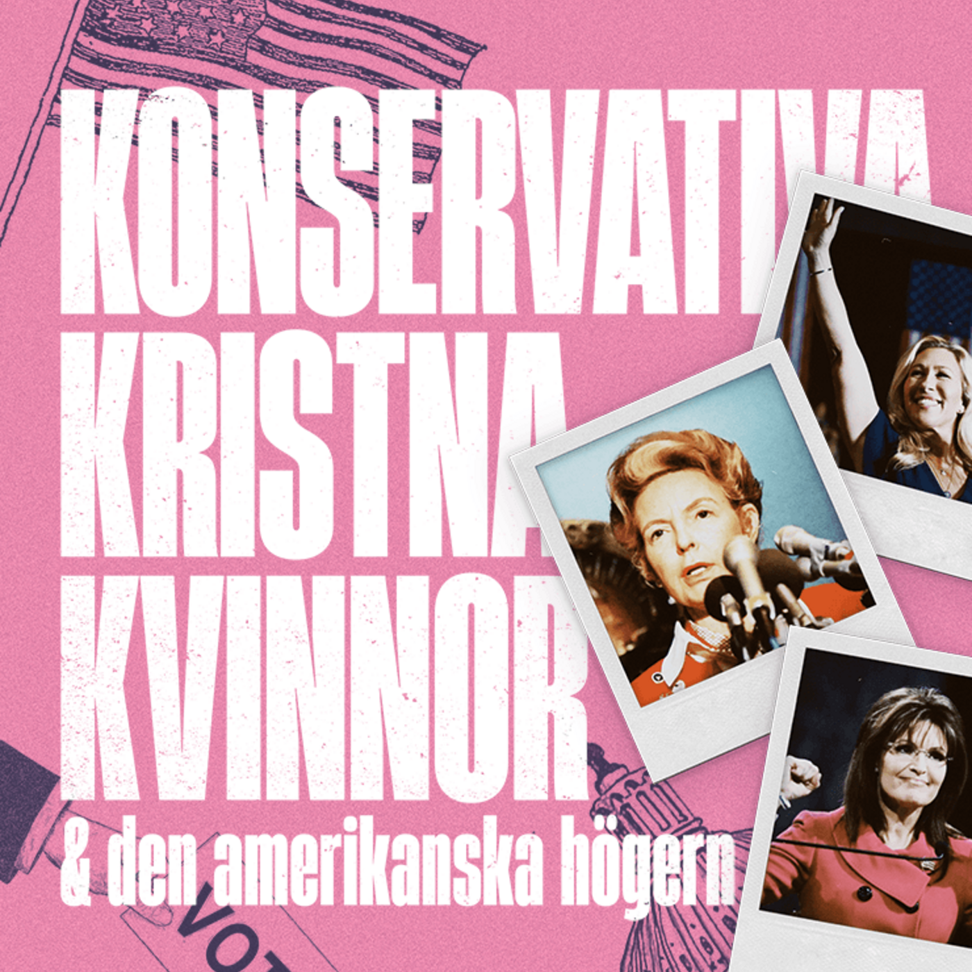 Medverkande: Martin Gelin, journalist och författare till boken “Den amerikanska högern: Republikanernas revolution - från Nixon till Trump”Hörs i programmet: Phyllis Schlafly, politikerSarah Palin, politikerMarjorie Taylor Green, politikerProducent: Gabriella LahtiExekutiv producent: Tove Friman LefflerSlutmix: Kristoffer KronanderEn produktion av Podlit