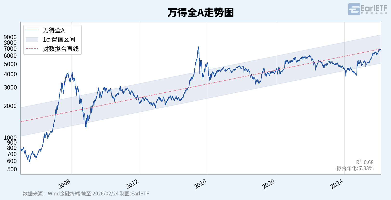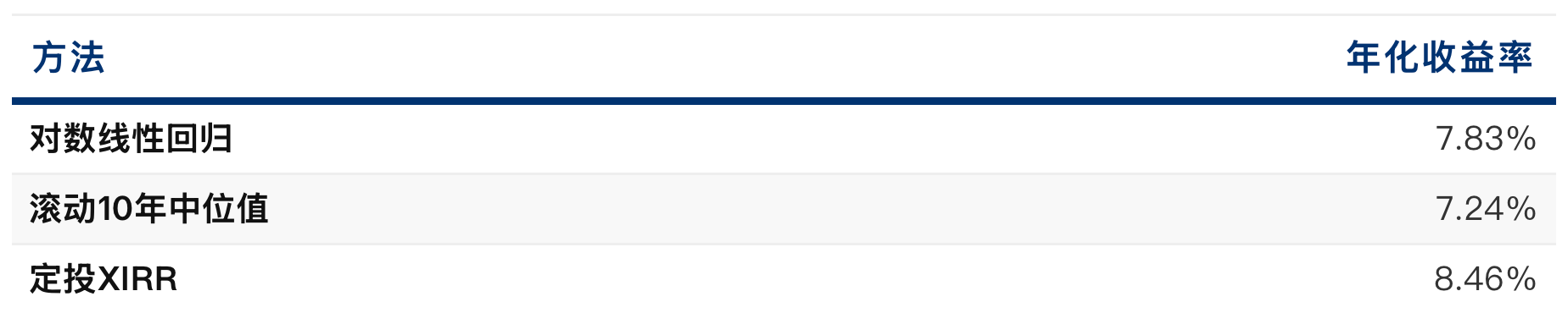 - 技术方法:引入对数线性回归,通过所有数据点拟合出一条年化7.83%的趋势线。