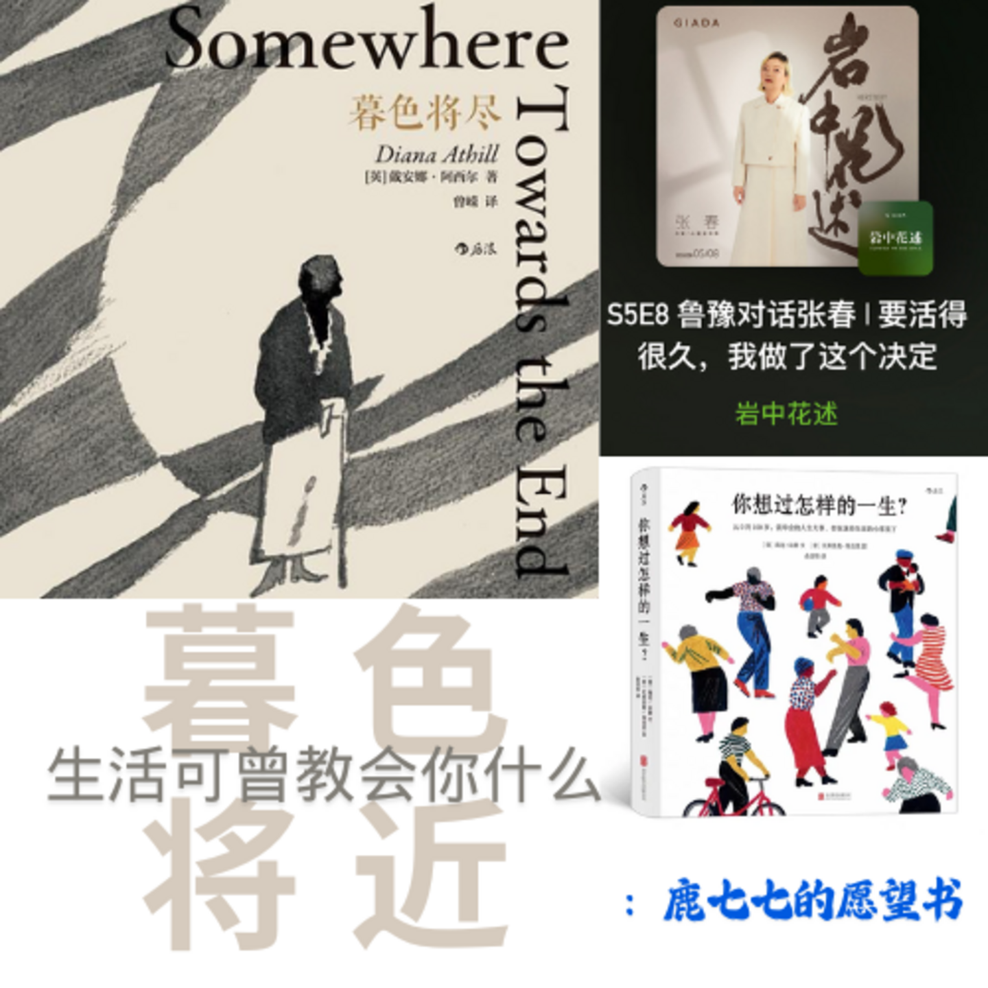 嗨,大家,欢迎来到鹿七七的愿望书。最近的阅读清单是《也许你该找个人聊聊》《暮色将尽》《你想过怎样的一生》《宝贵的人生建议》……还有李诞关于死亡的播客,岩中花述的鲁豫和张春那期“要活得很久”……