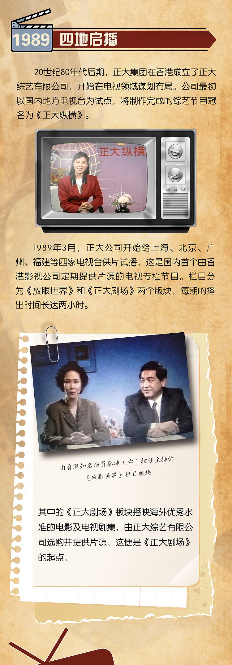1989年3月,正大公司开始给上海、北京、广州、福建等四家电视台供片试播,这是国内首个由香港影视公司定期提供片源的电视专栏节目。栏目分为《放眼世界》和《正大剧场》两个版块,每期的播出时间长达两小时。