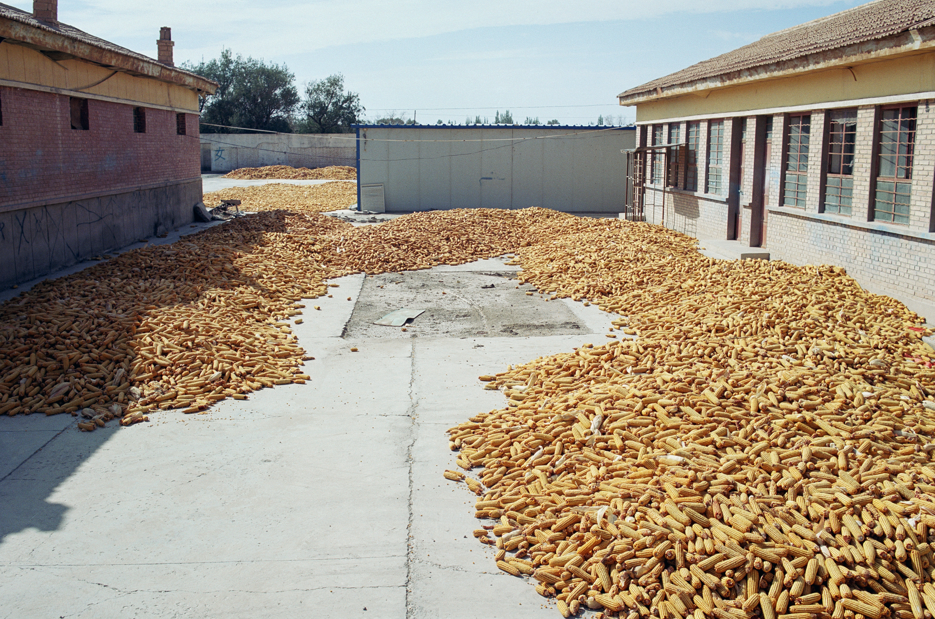 敦煌东线路过的小村子,到了玉米收成季节?到处都在晒玉米⬆️