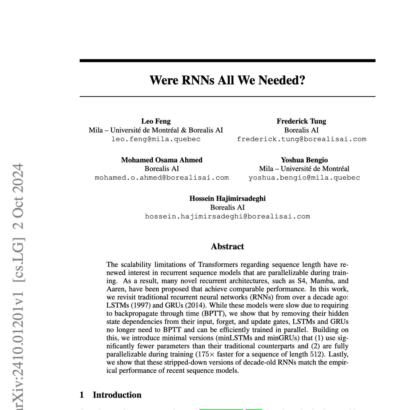 This research paper revisits traditional recurrent neural networks (RNNs) like LSTMs and GRUs, proposing simplified versions – minLSTM and minGRU – that address the scalability limitations of their predecessors while achieving comparable performance to modern sequence models.