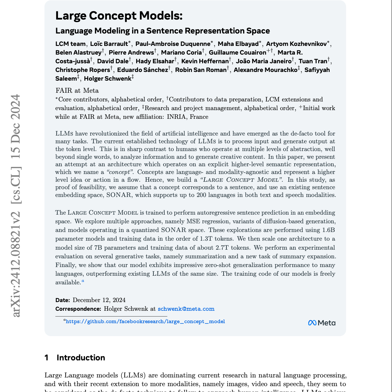 本文提出了大型概念模型(LCMs),一种新颖的语言建模方法,其操作基于句子嵌入而非单独的词元。LCMs 旨在通过处理更高层次的语义表示来模拟类似人类的抽象推理,从而改进长篇文本生成和零样本跨语言性能。作者探讨了多种 LCM 架构,包括基于均方误差回归和扩散模型的架构,并在摘要生成和一种新颖的摘要扩展任务上评估了它们的性能。研究结果表明,基于扩散的 LCMs 表现优于其他方法,在多种语言上的零样本泛化能力令人印象深刻。研究还探讨了在模型中引入显式规划的概念,以进一步增强长篇文本生成的连贯性。