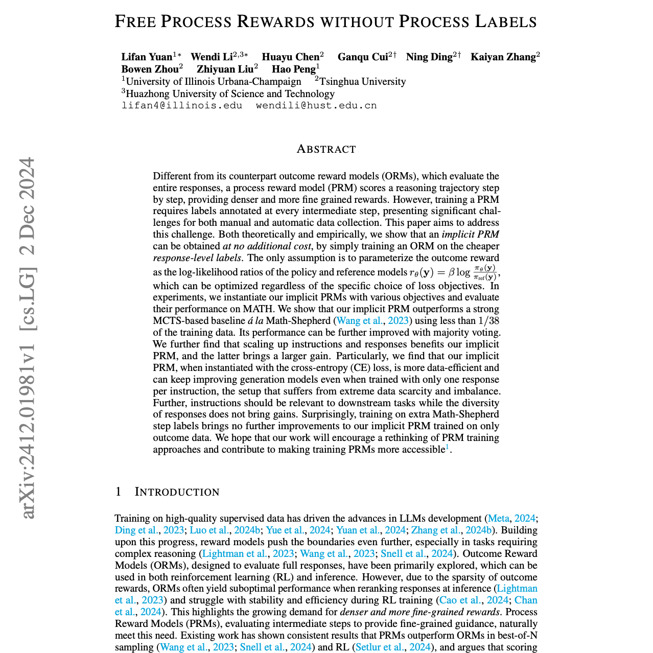 这篇研究论文提出了一种具有成本效益的训练过程奖励模型(PRMs)的方法,该模型用于评估推理过程中的中间步骤。与现有需要高成本步骤级标签的 PRM 不同,作者展示了一种通过特定奖励参数化训练结果奖励模型(ORM)来隐式学习强大的 PRM,且没有额外成本。该方法被称为“隐式 PRM”,在数学推理任务中优于现有基准,并显著减少了数据收集和训练开销。实验探索了使用不同损失函数的隐式 PRM 的各种实现,显示出一致的性能提升和数据效率。这些发现表明,PRM 训练方法可能迎来范式转变,使其在更广泛的应用中变得更加可访问。