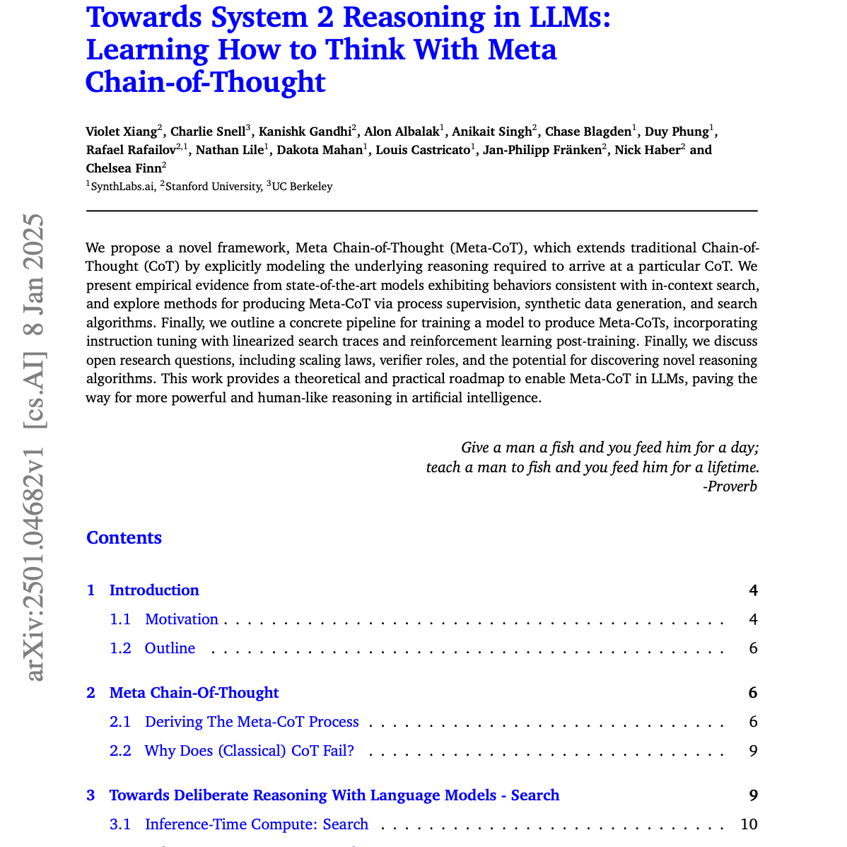 The paper "Towards System 2 Reasoning in LLMs" explores methods for improving the reasoning capabilities of large language models (LLMs). It introduces Meta Chain-of-Thought (Meta-CoT), a framework that models the reasoning process itself, going beyond traditional Chain-of-Thought prompting. The authors investigate using search algorithms, synthetic data, and reinforcement learning to train models that generate Meta-CoTs. Empirical results and scaling laws related to inference-time computation and the generator-verifier gap are presented, along with open research questions regarding the emergence of more human-like reasoning in AI. The included example problem-solving attempts illustrate different approaches to this challenge.