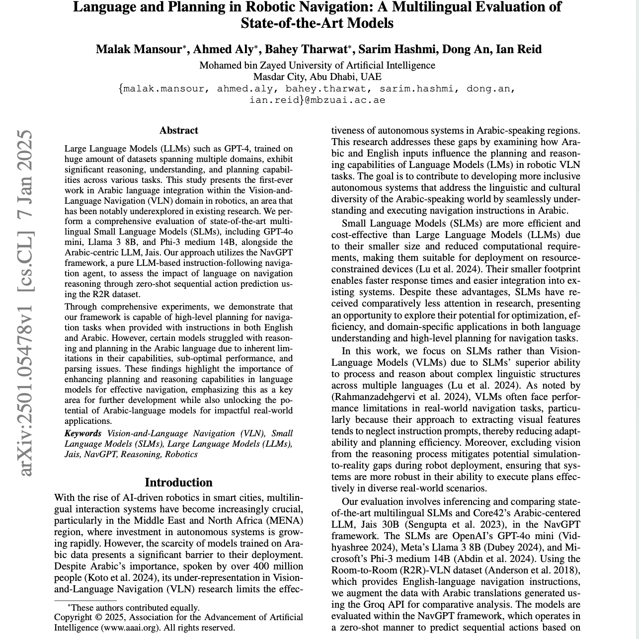这篇研究论文评估了几种多语言小型语言模型(SLMs)和一个以阿拉伯语为中心的大型语言模型(LLM)在视觉-语言导航(VLN)任务中的表现。使用NavGPT框架和一个双语(英语和阿拉伯语)版本的R2R数据集,研究评估了这些模型在两种语言中的推理和规划能力。研究结果强调了强大多语言模型在有效VLN中的重要性,特别是在阿拉伯语地区,这些资源仍然较为匮乏。研究还指出了当前模型的局限性,包括语法解析问题和不足的推理能力,并提出了未来发展的方向。通过定量和定性分析,论文比较了这些模型在不同语言中的成功率、导航错误和规划策略。