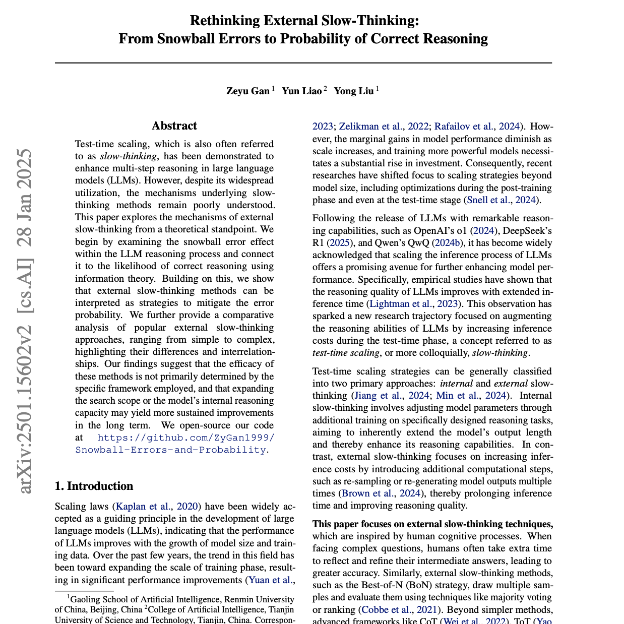 本文研究了大型语言模型(LLMs)中的**“慢思考”(slow-thinking)现象,即增加计算时间如何提升推理能力**。作者从理论角度分析了 LLM 推理过程中错误的积累机制,并将其定义为**“滚雪球错误”(snowball errors),借助信息论揭示了正确推理概率随推理深度降低的趋势**。研究提出,外部慢思考方法(如扩展解空间搜索)主要通过降低错误概率来提升推理质量。对比分析了多种慢思考方法,包括Best-of-N 和 蒙特卡洛树搜索(MCTS),结果表明,其有效性更多取决于评估机制的可靠性和计算成本,而非具体算法框架。最终,研究强调优化奖励函数和核心推理能力的重要性,以改进慢思考策略。