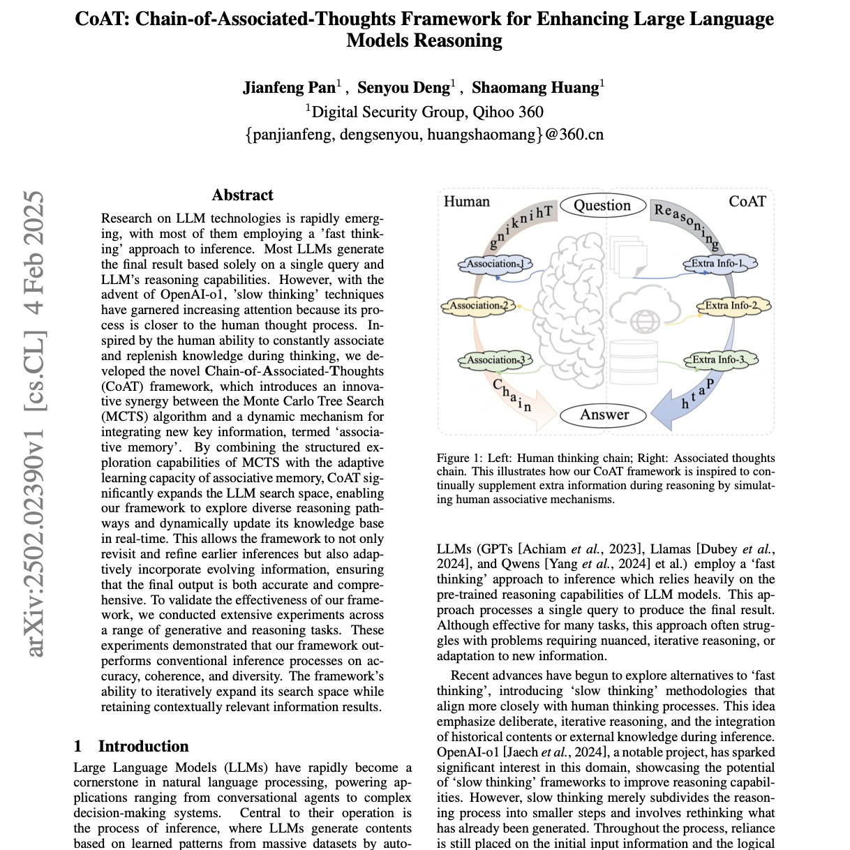 本文提出了 CoAT,一个创新框架,旨在增强大型语言模型(LLMs)的推理能力。受人类认知启发,CoAT 结合了蒙特卡洛树搜索(MCTS),用于结构化探索推理路径,并引入联想记忆机制,动态整合新信息。这种协同作用使 LLMs 能够回溯先前推理并适应不断变化的数据,从而生成更准确、连贯、多样的输出。通过广泛实验,包括与其他知识增强方法及微调模型的对比,研究验证了 CoAT 在生成与推理任务中的有效性。论文详细介绍了 CoAT 的架构与实现,包括联想记忆模块和优化的 MCTS 算法,并在多个NLP 和代码生成基准上提供了定性和定量证据,证明其卓越性能。