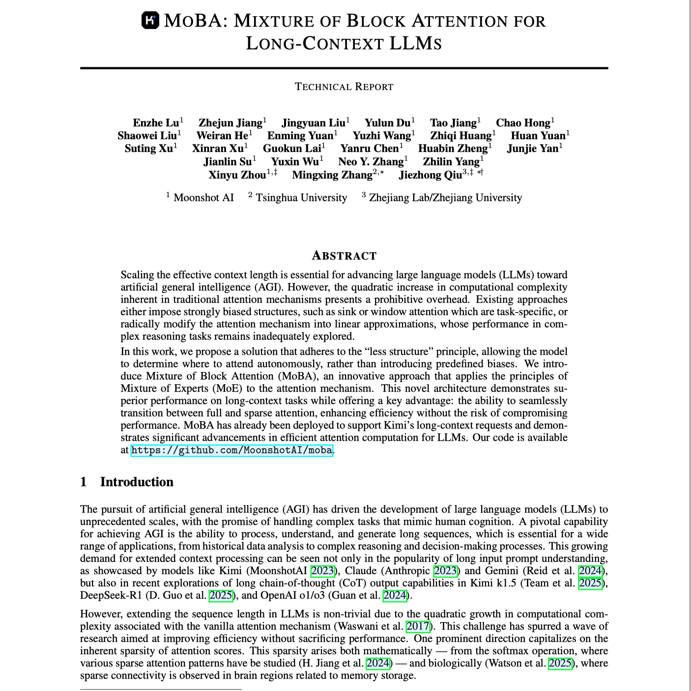 这份技术报告介绍了块注意力混合(MoBA),一种旨在提高长上下文大型语言模型效率的新方法。MoBA将**专家混合(Mixture of Experts)**原则应用于注意力机制,使模型能够选择性地关注相关的信息块,而非处理整个上下文。这种方法降低了传统注意力机制的计算成本,同时在长上下文任务中仍能保持强劲的表现。