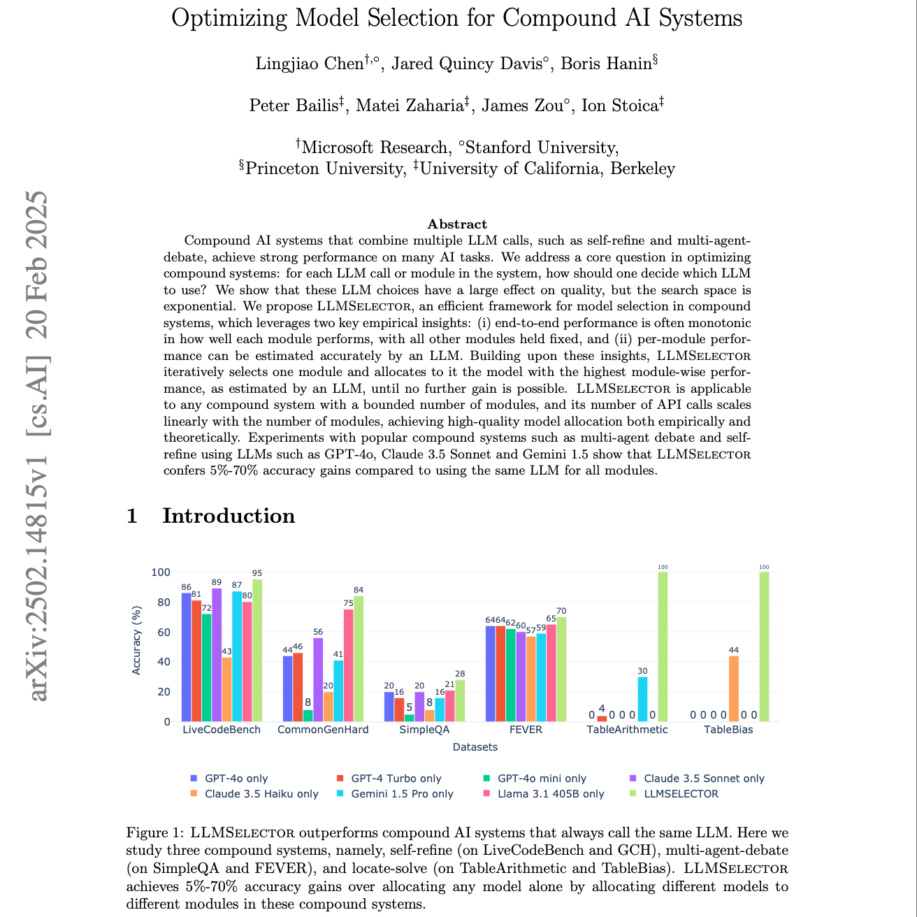 本文聚焦于复合型AI系统中如何为各个组件选择最合适的大型语言模型(LLMs)这一关键挑战。鉴于不同LLMs在子任务上的表现各有优劣,作者提出了 LLMSelector 框架,用于高效识别并分配性能优异的模型到各个模块。LLMSelector通过迭代评估模块级性能,智能地将不同模型分配给最合适的任务模块。