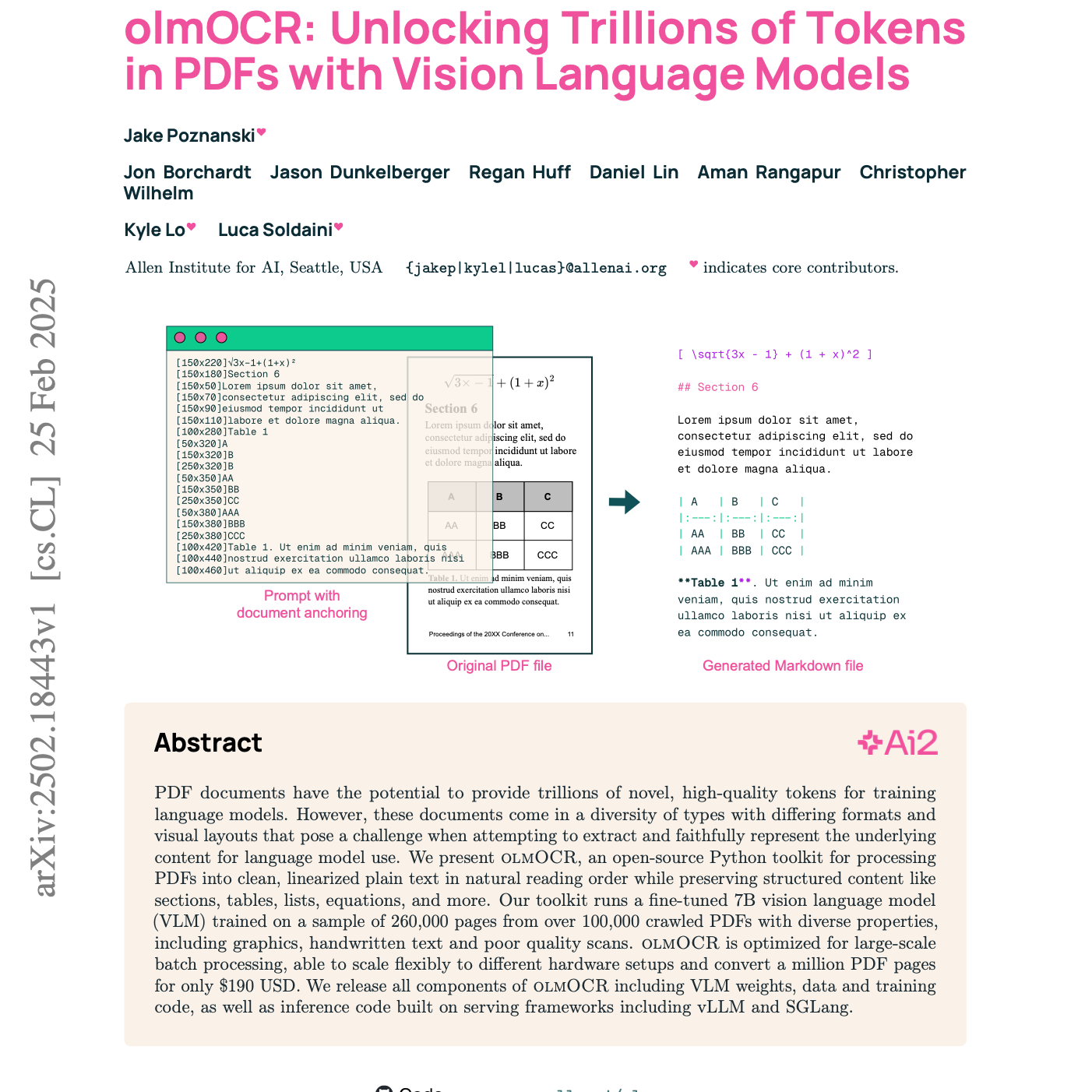 这段文字介绍了一个名为 olmOCR 的开源工具,旨在处理 PDF 文档并提取高质量文本用于训练大型语言模型。该工具通过文档锚定技术结合一个经过微调的视觉语言模型来准确地识别和线性化 PDF 内容,包括表格、公式等结构化数据。olmOCR 的开发涉及构建一个大型多样化的 PDF 数据集用于模型训练。与现有方法相比,该工具处理效率更高且成本显著降低,并且通过多种策略提高了鲁棒性。实验结果表明 olmOCR 在文本提取质量上优于其他流行工具,并且用其处理的数据训练语言模型能带来性能提升。